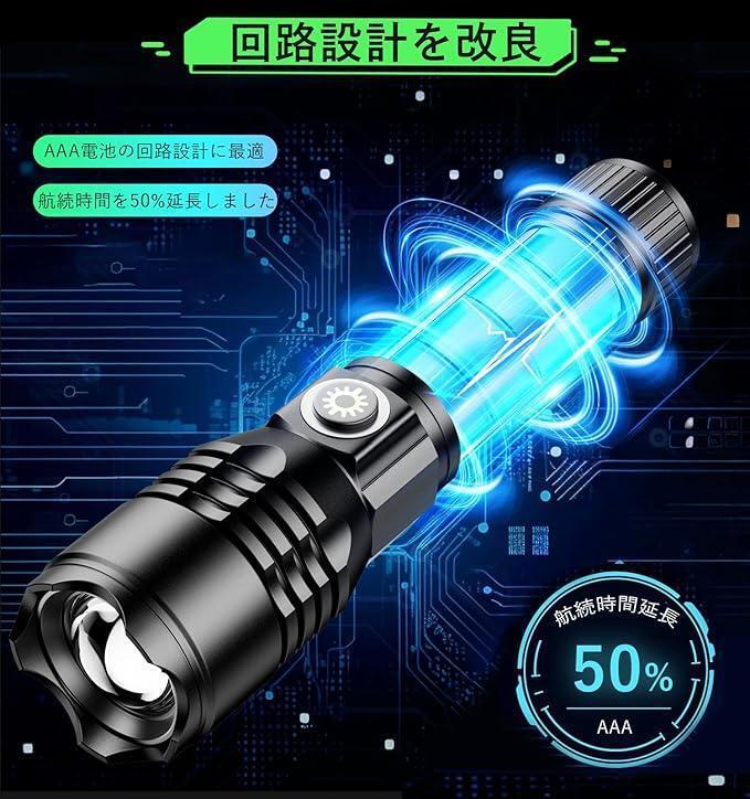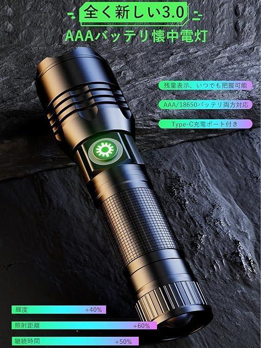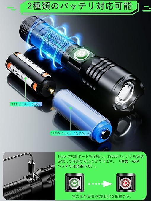 【独占アップグレード多機能AAA電池懐中電灯】 独占に開発した小型で超明るいAAA電池懐中電灯をアップグレードします。「アップグレード1」には新型高輝度TG-1120超長遠射LEDランプビーズを採用,従来のAAA電池懐中電灯に比べて、輝度は40%、照射距離は60%向上した。遠くの物体にフォーカスするとき,絞りが丸くて明るい,影がありません,遠隔照明の時も物体がはっきり見える。「アップグレード2」は懐中電灯の回路設計を改良した。従来のUSB充電式懐中電灯に比べて。この懐中電灯はAAA電池に更適しています。AAAバッテリの航続時間を50%延長しました。「アップグレード3」革新性により、単四電池の残量表示機能が追加され、単四電池と18650電池の残量をリアルタイムで知ることができる。「アップグレード4」はAAA電池(付属)と18650 充電バッテリー(付属していない)の2種類のモデルに対応しており、自分のニーズに合わせて電池を選んで使用することができます。Type-C充電ポートを接続して18650バッテリを循環充電して使用することができます(注意:AAAバッテリは充電不可)。