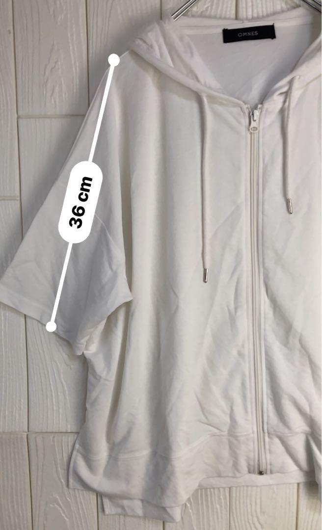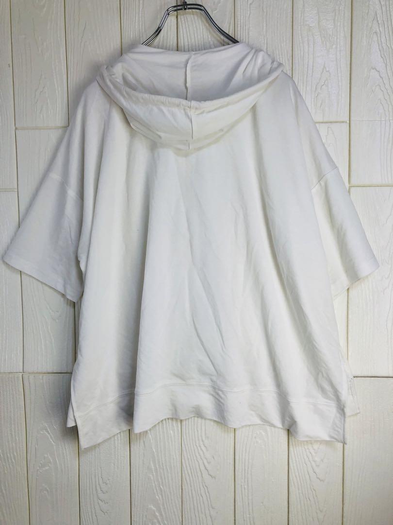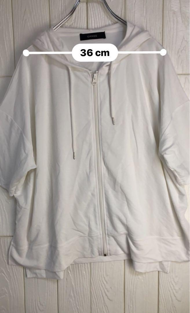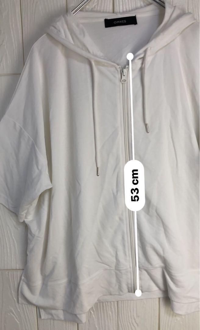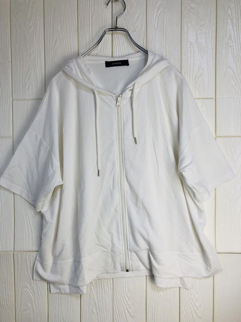 シンプルなホワイトのジップパーカー、ゆったりとしたシルエットで快適な着心地。