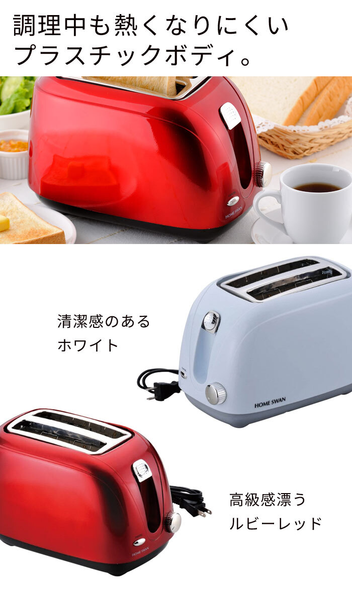 調理中も熱くなりにくいプラスチックボディのポップアップトースター。 一度に2枚のパンとトーストできます。 使い方は簡単。自分好みの「焼き加減」にツマミを設定し、食パンをスロット部分に入れて、あとはゆっくりレバーを下げるだけ。 ふっくらとしたトーストを簡単にご家庭で楽しめます。 高級感漂うルビーレッド、清潔感のあるホワイトの全2色。 |