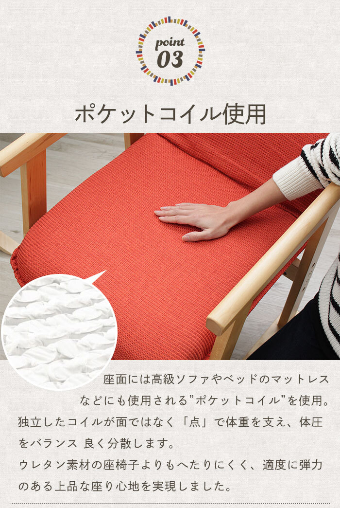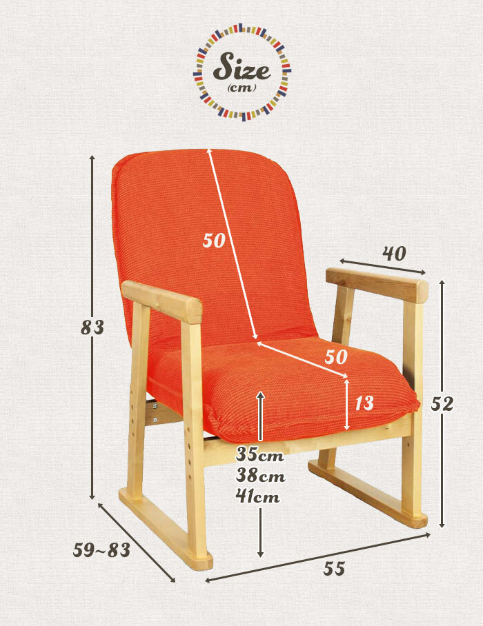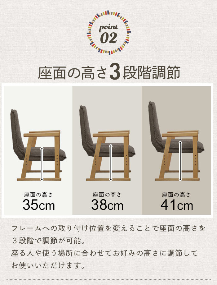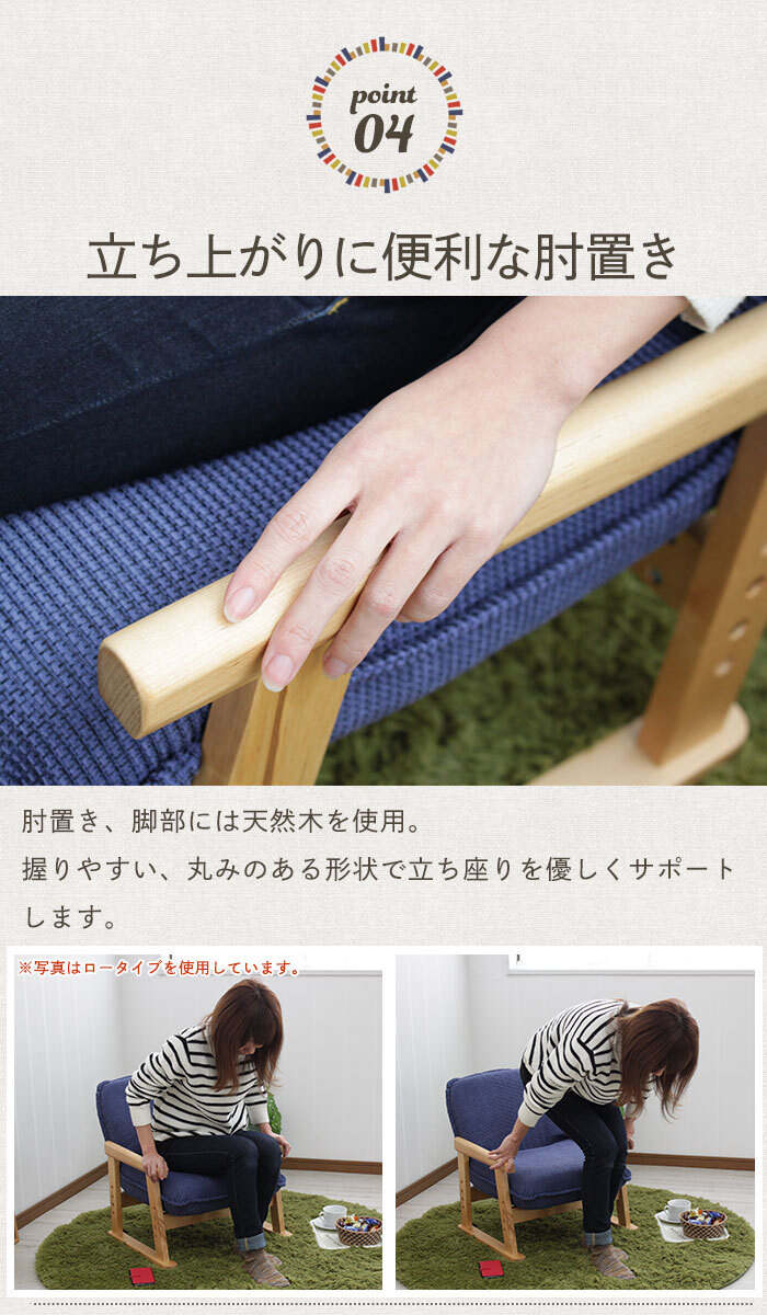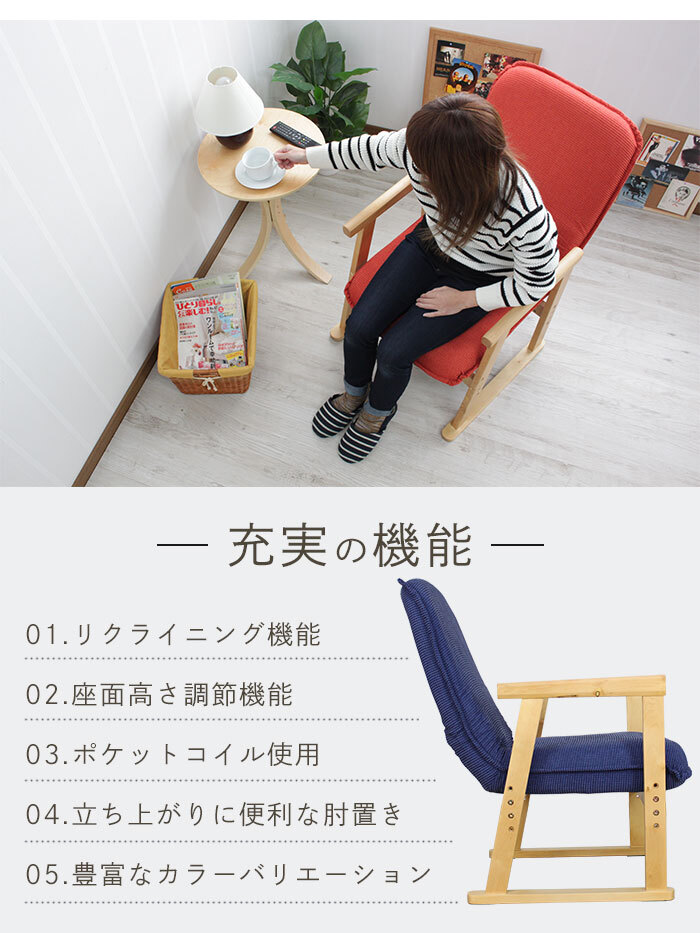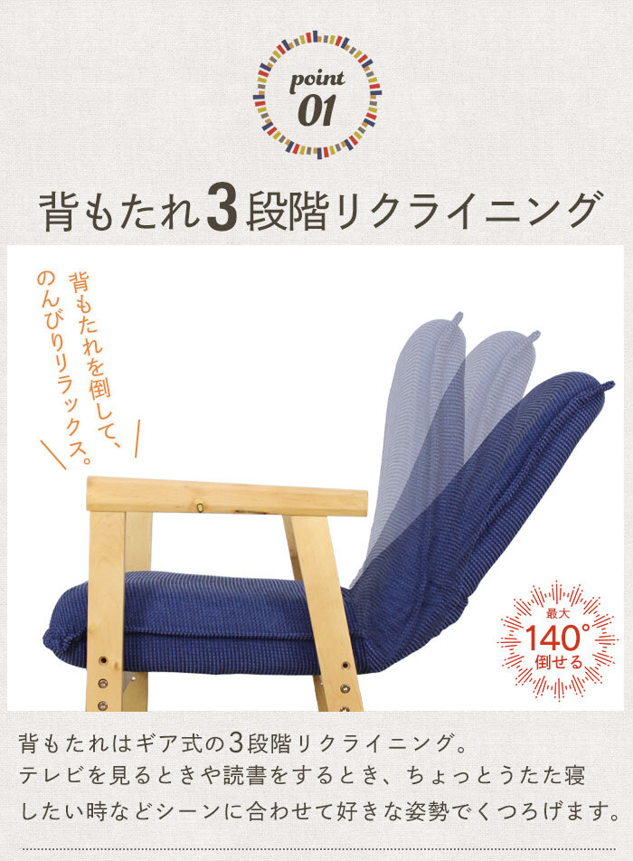 | 背もたれはギア式の3段階リクライニング。 テレビを見る時や読書をするとき、ちょっとうたた寝したい時など自分の好きな姿勢で寛げます。 フレームへの取り付け位置を変えることで座面の高さを「35cm・38cm・41cm」の3段階で調節できます。 座面にはソファなどに使われる「ポケットコイル」を使用しているので、ヘタリにくく弾力のある快適な座り心地。 フレームは天然木を使用。 肘置きに丸みを持たせ、立ち上がる際もしっかり握ることができます。 脚裏にはフェルトが付いているので、床や畳の傷を防ぎます。 和室にも洋室にも溶け込む、ちょっとくすんだ色合い。 ブルー、オレンジ、グリーン、ブラウンの4色よりお選びいただけます。 |