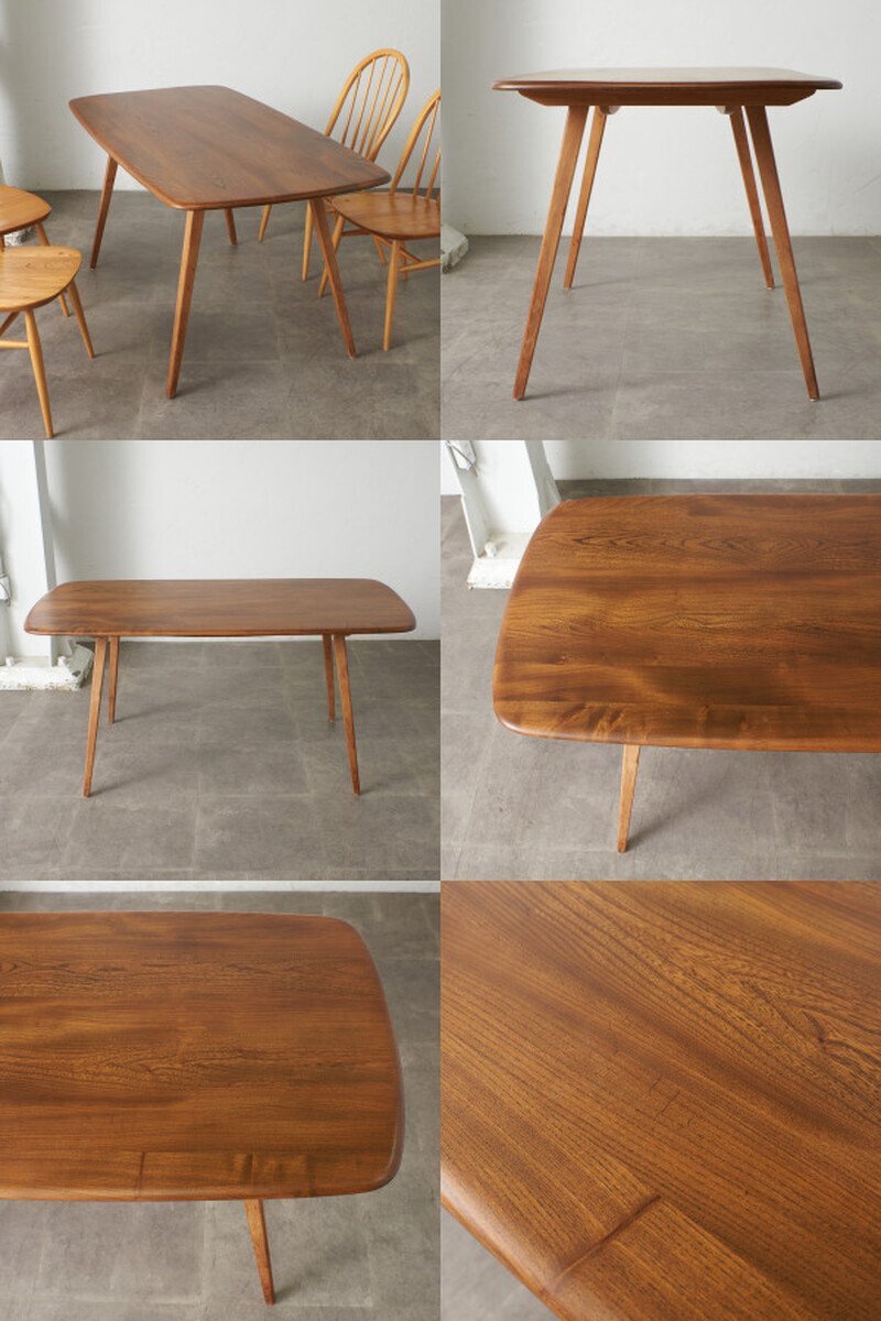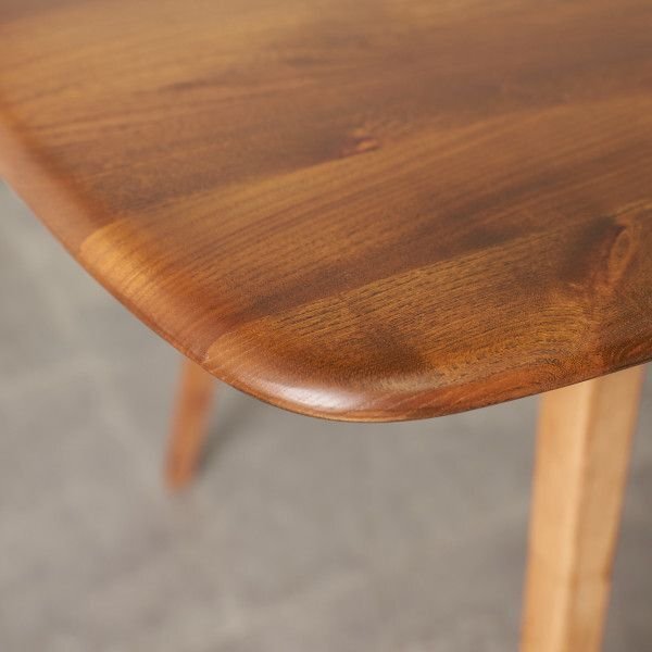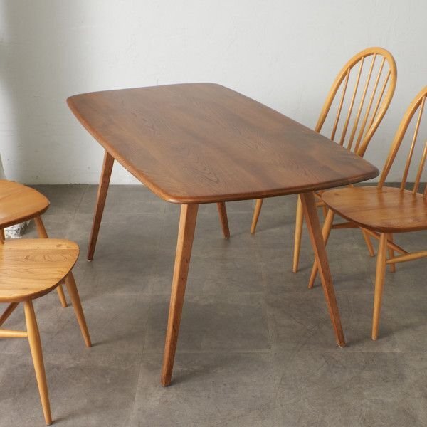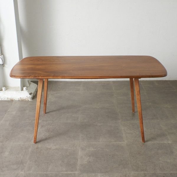 広々とした天板が特徴的で、1956年に6人用のテーブルとしてデザインされたのが始まりです。角が丸く仕上げられた天板の曲線と、ERCOLらしい末広がりな角脚のバランスが際立つシンプルでスタイリッシュなフォルム。どんな空間にもコーディネートできるデザインなので、チェアと組み合わせがしやすいとても人気が高いテーブルです。