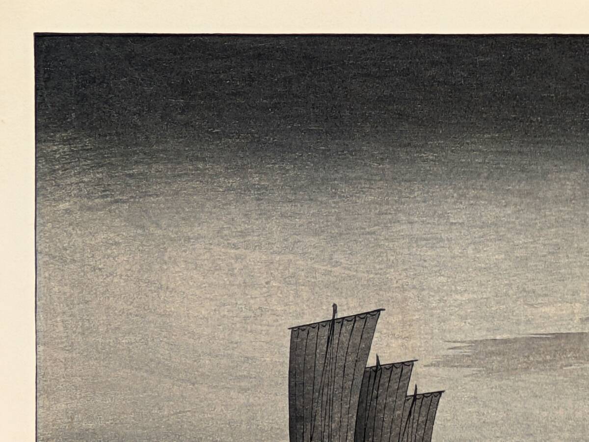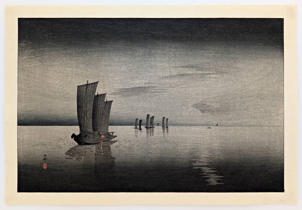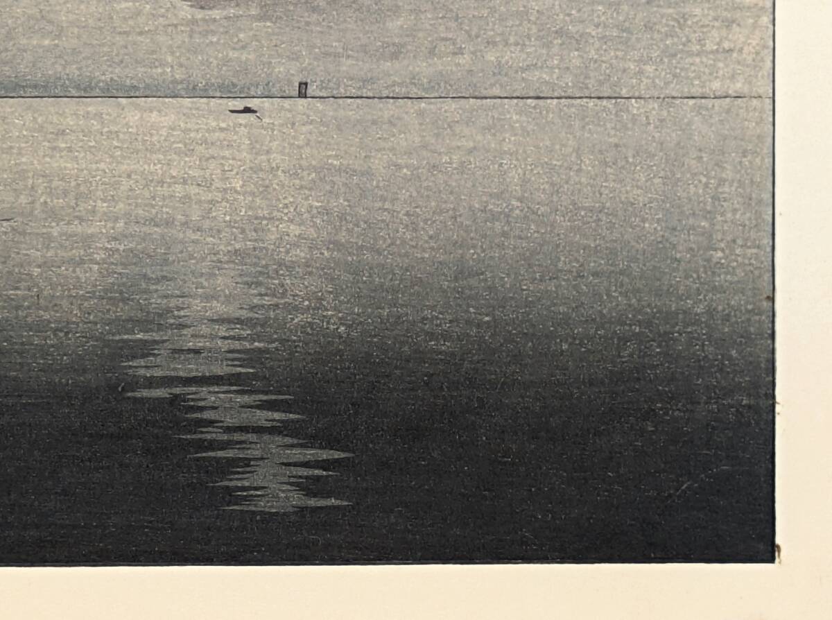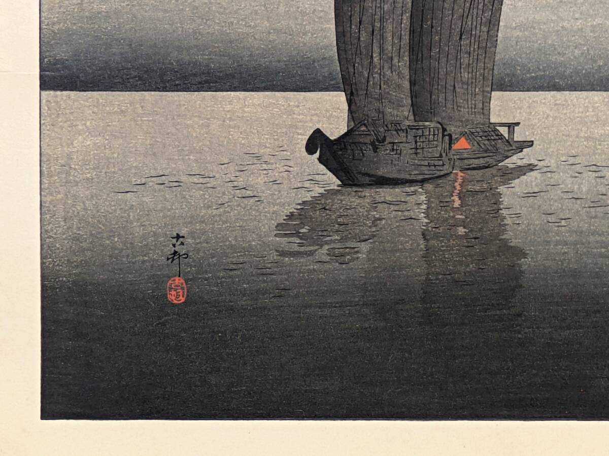 | ご覧頂きありがとうございます。 『帆船』と題された小原古邨(祥邨)の明治後期、古邨初期の作品です。花鳥画以外は数少ない古邨の風景画作品として珍しい作品です。国内外でも市場に出た事が少ない大変希少な作品です。 美しい夜明けの海をゆったりと行く帆船を独特の詩的な描写で表現した、古邨の風景画作品の名品です。画像ではお伝えしにくい部分ですが、帆船の非常に細かいラインが初摺りであることを物語っています。 海外では現在でもコレクターが多いのですが、日本国内には作品が残っておらず、まさに「知る人ぞ知る」存在でした。こちらの作品は米国のコレクター放出品の為、日本国内の市場には出た事が少ない大変希少な作品で、現品限りとなりますのでお早めにご入札ください。 古邨(祥邨)の木版画は日本にやってきた欧米人のお土産品として絶大な人気を博しました。ジャポニズムの影響を多大に受けた天才画家グスタフ・クリムトも古邨の木版画を愛蔵していたと言われています。 【寸法】 シートサイズ : 37.4cm×25.5cm 摺面サイズ : 34.1cm×23.3cm 【状態】 100年以上前の作品ながら保存状態が大変に良く、和紙の劣化、シミなどは殆ど見られず、摺面は強い摺り色が残されておりオリジナル作品の状態が保たれています。 画像、商品説明をご覧いただき、是非ともこの機会に滅多に出てこない逸品を入手して頂きたいと思います。他にも出品しておりますのでよろしかったらご覧ください。 | ||||