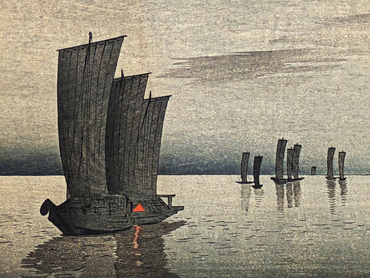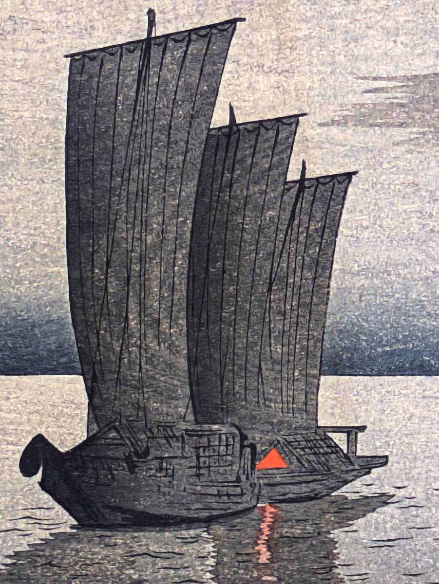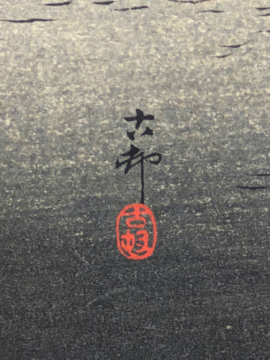 | ご覧頂きありがとうございます。 『帆船』と題された小原古邨(祥邨)の明治後期、古邨初期の作品です。花鳥画以外は数少ない古邨の風景画作品として珍しい作品です。国内外でも市場に出た事が少ない大変希少な作品です。 美しい夜明けの海をゆったりと行く帆船を独特の詩的な描写で表現した、古邨の風景画作品の名品です。画像ではお伝えしにくい部分ですが、帆船の非常に細かいラインが初摺りであることを物語っています。 海外では現在でもコレクターが多いのですが、日本国内には作品が残っておらず、まさに「知る人ぞ知る」存在でした。こちらの作品は米国のコレクター放出品の為、日本国内の市場には出た事が少ない大変希少な作品で、現品限りとなりますのでお早めにご入札ください。 古邨(祥邨)の木版画は日本にやってきた欧米人のお土産品として絶大な人気を博しました。ジャポニズムの影響を多大に受けた天才画家グスタフ・クリムトも古邨の木版画を愛蔵していたと言われています。 【寸法】 シートサイズ : 37.4cm×25.5cm 摺面サイズ : 34.1cm×23.3cm 【状態】 100年以上前の作品ながら保存状態が大変に良く、和紙の劣化、シミなどは殆ど見られず、摺面は強い摺り色が残されておりオリジナル作品の状態が保たれています。 画像、商品説明をご覧いただき、是非ともこの機会に滅多に出てこない逸品を入手して頂きたいと思います。他にも出品しておりますのでよろしかったらご覧ください。 | ||||