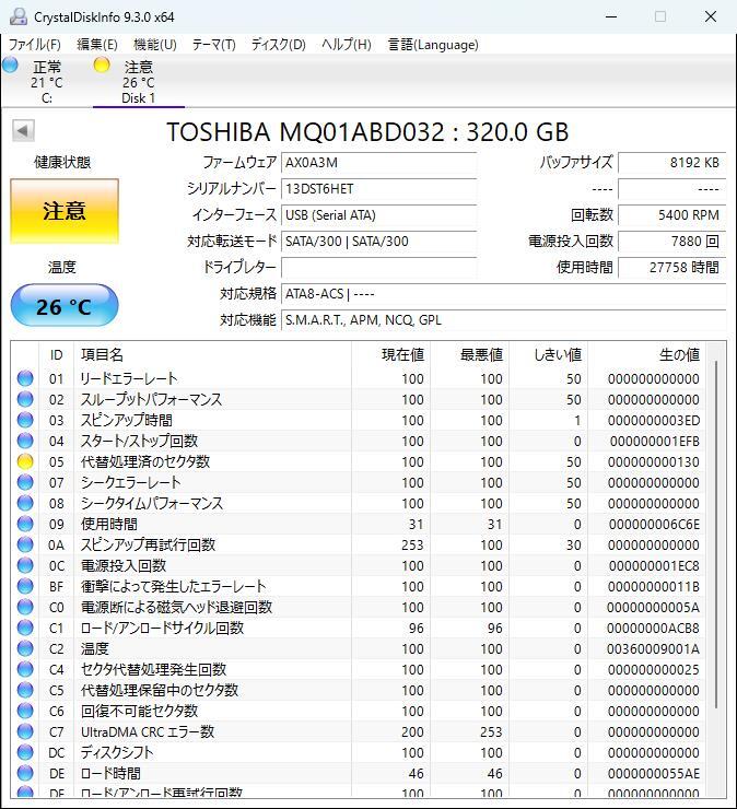CrystalDiskInfoで注意判定のためジャンクとしての出品です。使用時間などの詳細は画像でご確認ください。