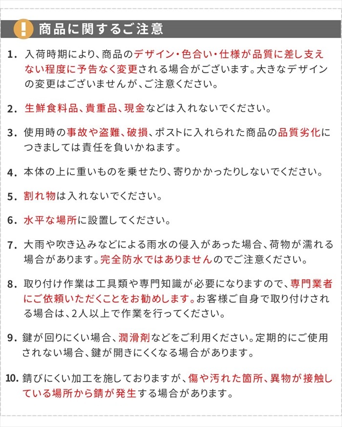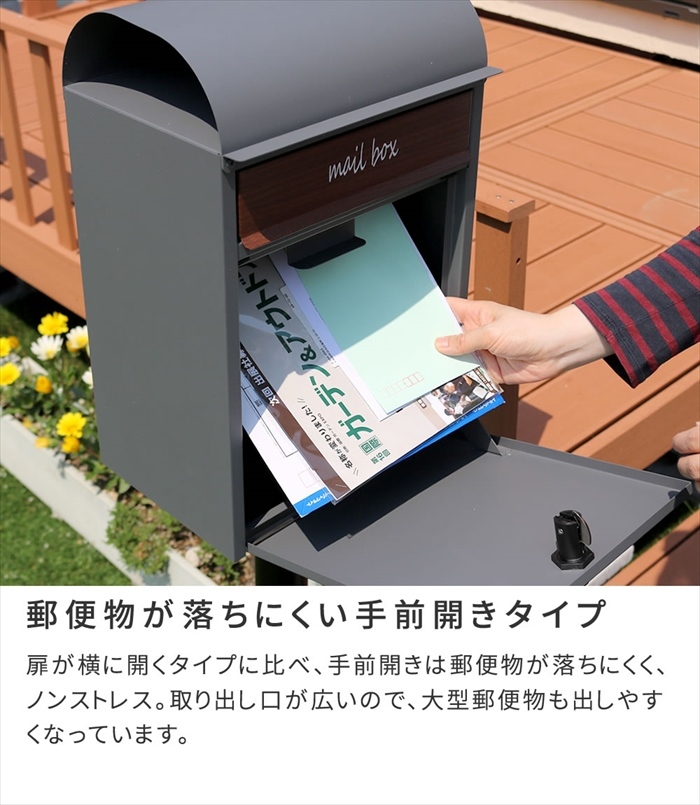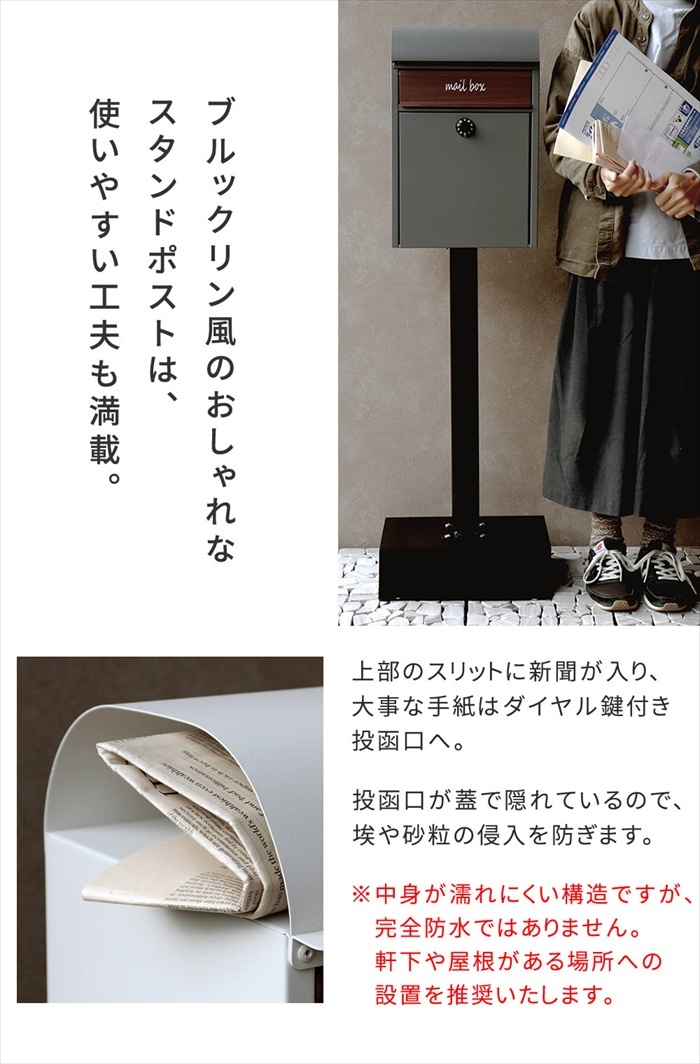 | ◇スタンドタイプなら設置も簡単。郵便物を片手で取り出せて便利です。 「毎朝の新聞はサッと取り出したい」 「海外の住宅のような雰囲気のあるポストがいいな」 そんな気持ちを満たしてくれる、マットなニュアンスカラーのポストです。 レトロなダイヤルと、木目の投函口が、表情豊かで素敵ですね♪ ◇ブルックリン風のおしゃれなスタンドポストは、使いやすい工夫も満載。 新聞は上部のスリットに。大事な手紙は、ダイヤル鍵付き投函口へ。 投函口が蓋で隠れているので、雨や埃の侵入を防ぎます。 ※中身が濡れにくい構造ですが、完全防水ではありません。軒下や屋根がある場所への設置を推奨いたします。 ◇郵便物が落ちにくい手前開きタイプ。 扉が横に開くタイプに比べ、手前開きは郵便物が落ちにくく、ノンストレス。 取り出し口が広いので、大型郵便物も出しやすくなっています。 ◇ダイヤル錠付きで防犯面も安心です。 ダイヤル錠は、鍵を取り出す手間が省けるとともに、鍵の紛失の心配がないのもいいですね。 ◇グレー、グレージュの2色。 |