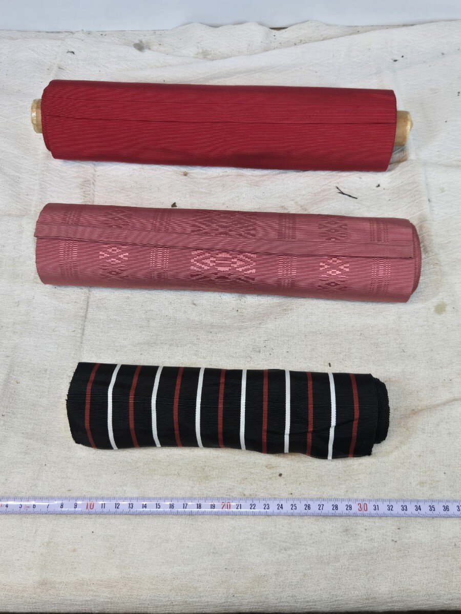 ・帯地反物:名古屋帯・半幅帯の仕立て、生地取り、バッグ・クラッチ・がま口、テーブルランナー、ランチョンマット、銘々皿の敷物などの和モダンインテリアへ。黒×白×朱の縞は現代着こなしや洋服リメイクにも相性が良く、ピンク系の地紋はやわらかな光の反射で質感が引き立ちます。深紅無地系は差し色用途に使いやすく、パーツ取りにも向きます。