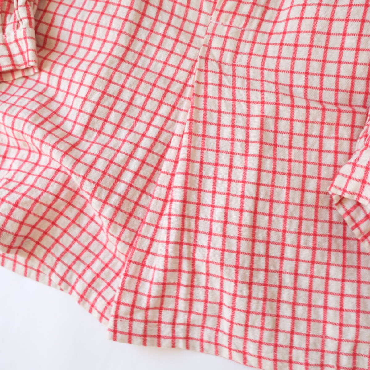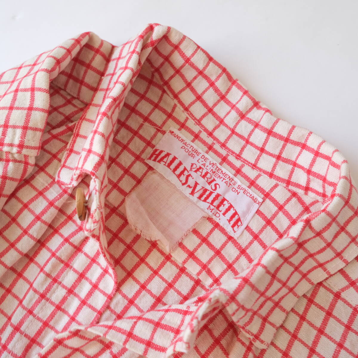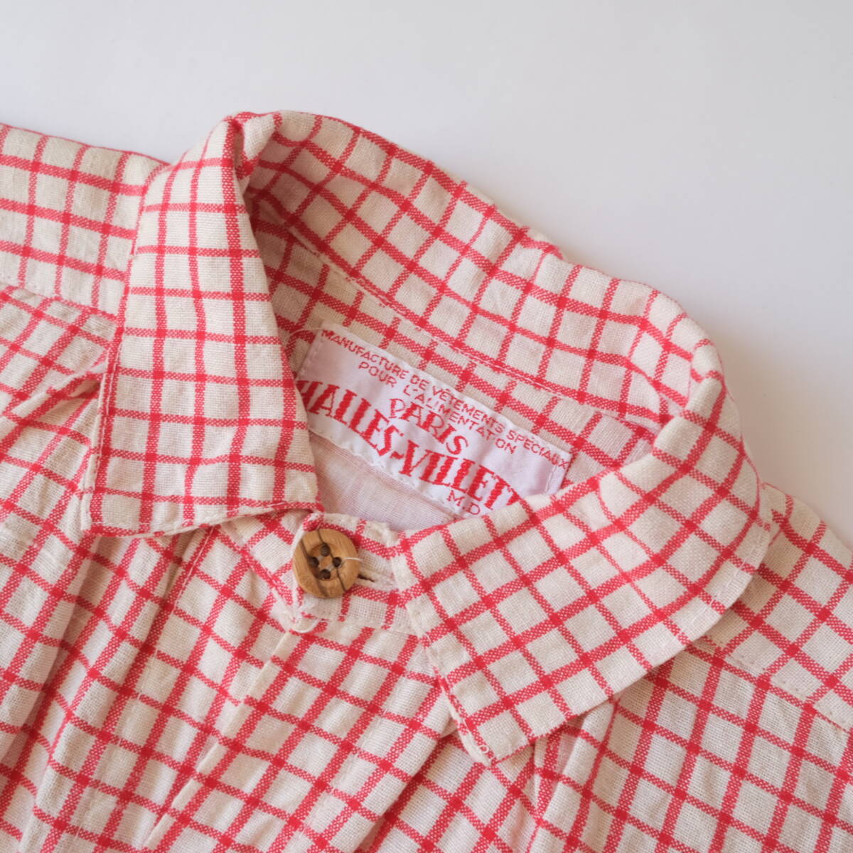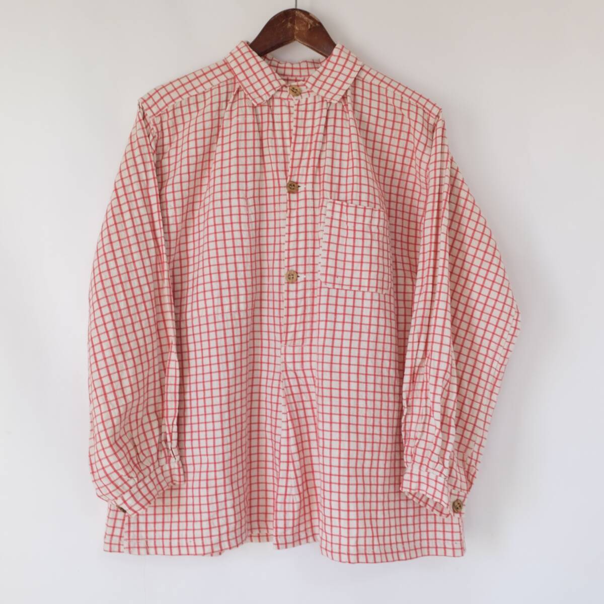 【 フランス ビンテージ 】リネン コットン チェック プルオーバー 長袖シャツ / ホワイト レッド 白赤系 / ヨーロッパ スモック 麻