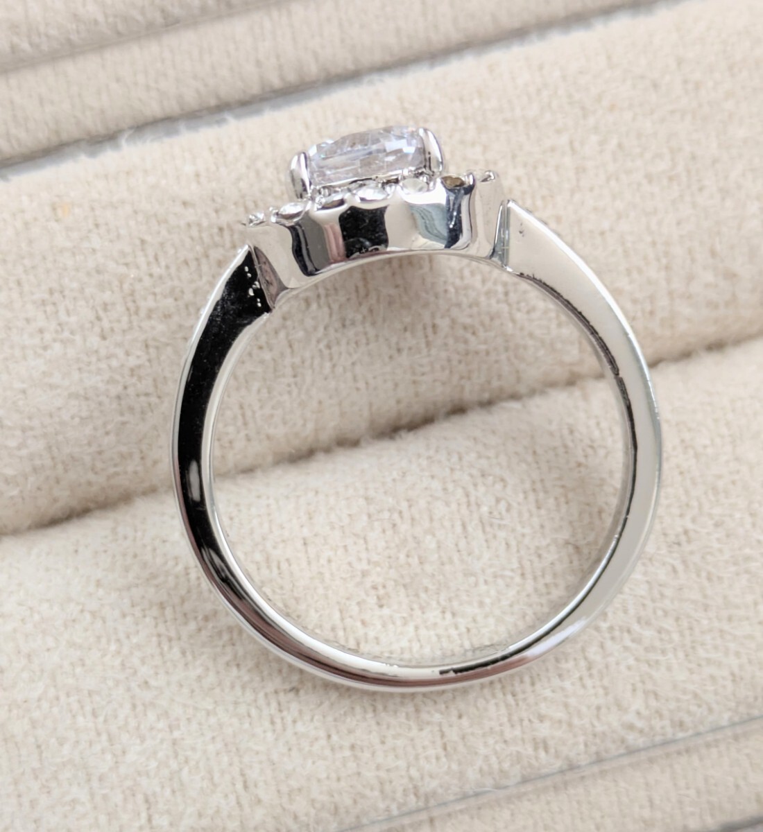 ラウンドカットのストーンを中心にしたシルバーリング、人工ダイヤモンドの装飾が魅力的。