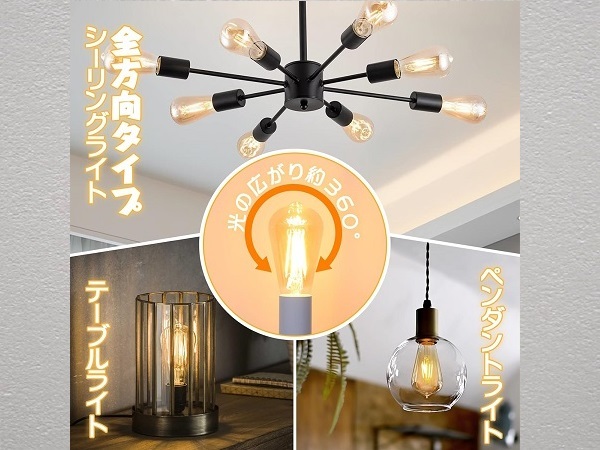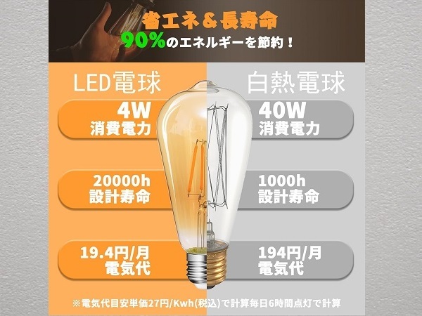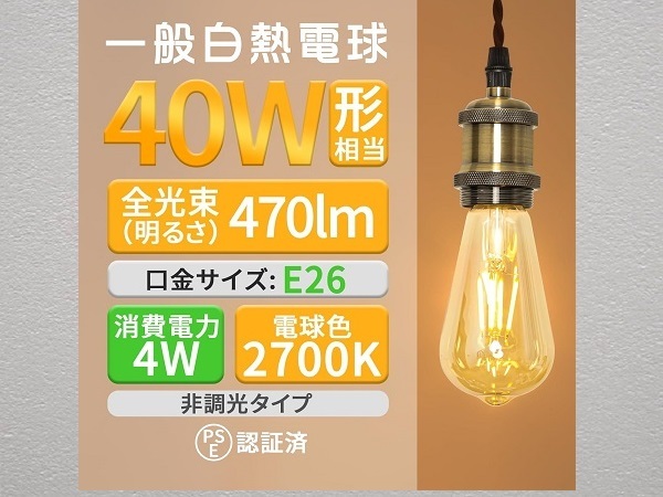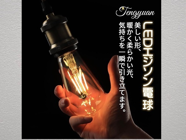 Tengyuan LED電球 フィラメント電球 e26 エジソン電球 40W 形 1個 新品 です。■【商品仕様】口金サイズ:26mm、電球サイズ:直径64mmx高さ142mm、定格消費電力:4W、定格電圧:AC100V 50/60Hz、色温度:2700K(電球色)、全光束:470lm、演色性:82+。※ご注意:40W形相当なので、60W形より暗く、雰囲気を重視する方にお薦めです。■【レトロな雰囲気】伝統的なスタイルと現代のテクノロジーを完璧に融合したLED電球です。クラシックなエジソンスタイルのデザインを採用しており、そのレトロな雰囲気であなたの気持ちを一瞬で引き立てます。単なるLED電球に留まらず、空間の装飾にアートの要素を加えた絶妙な一品です。■【全方向タイプ】360°全方向照射!演色性はRa82以上に達し、物の色を自然で綺麗に再現可能です。暖かく柔らかい光がアンバーガラスを通した瞬間に、部屋の雰囲気を変え、温かみのあるロマンチックな空間を作り上げました。ロマンチックなディナーの場で使用するのか、リラックスした読書のひとときを楽しむのか、比類のない快適さをもたらしてくれます。■【省エネ&長寿命】従来品をアップグレードされ、消費電力が僅か4Wで、明るさは白熱電球の40W形相当で、従来の白熱電球と比べ、消費電力が90%を削減できます。設計寿命約20000時間なので、頻繁に引換する手間を省きます。また、有害な水銀が含まない、紫外線と赤外線をほとんど出さないため、虫が寄りにくい。コスパが高くて、家計に優しい商品です。■【PSE認証済&2年保証】PSE認証を取得済です、日本国内規格の品質、安全性が担保されており、レストラン、階段、玄関、ダイニング、店舗、ホテル、キッチン、リビングなどのところに安心してご利用頂けます。倉庫での保管の新品と聞いているのみで中身の確認等はしておりません。よって商品の内容は把握しておりません。また外箱が汚れていたり傷ややぶれがある場合があります。その点をご理解いただき神経質な方はご入札をお控えいただきノークレームノーリターンでのお取引願います。
