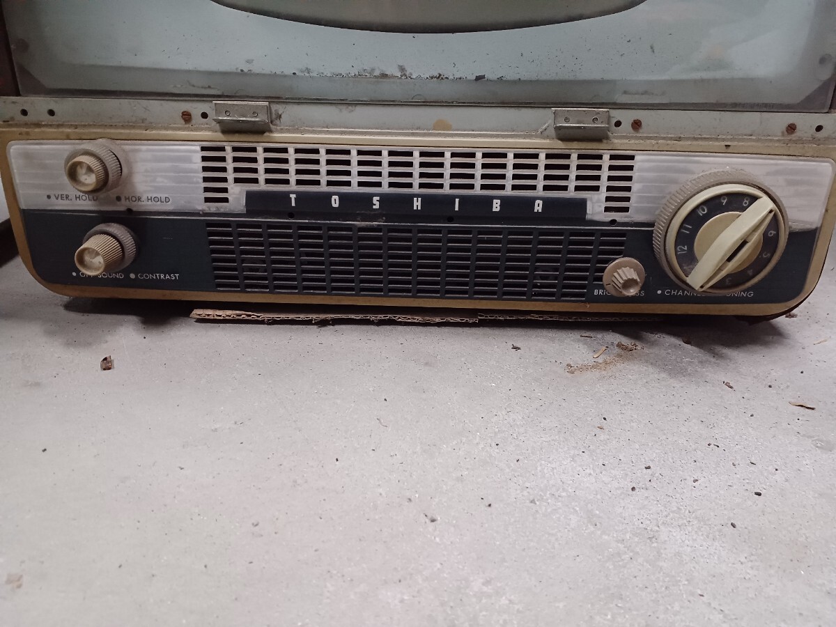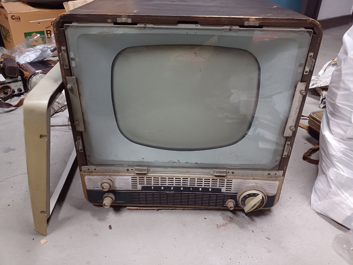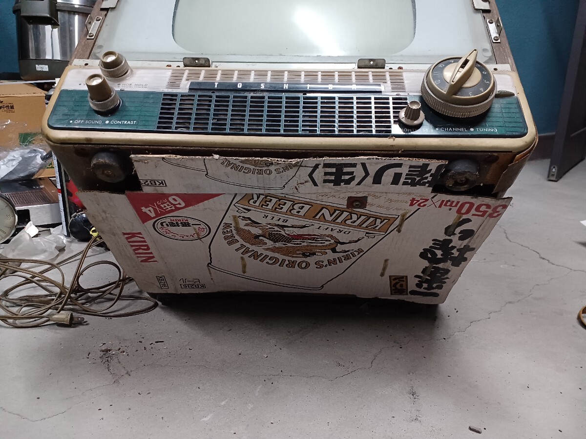 東芝真空管テレビです。倉庫保管してありました。コンセント入れてジーっと少し音出ましたが匂いがしたのですぐに抜きました。底は段ボールで加工してありますので画像確認お願いします。約19インチ位の大きさでした。中古品になりますので3nです。画像7のカバーのネジないのでネジ止めれば動きません。中古品になりますので3nです。140サイズです。