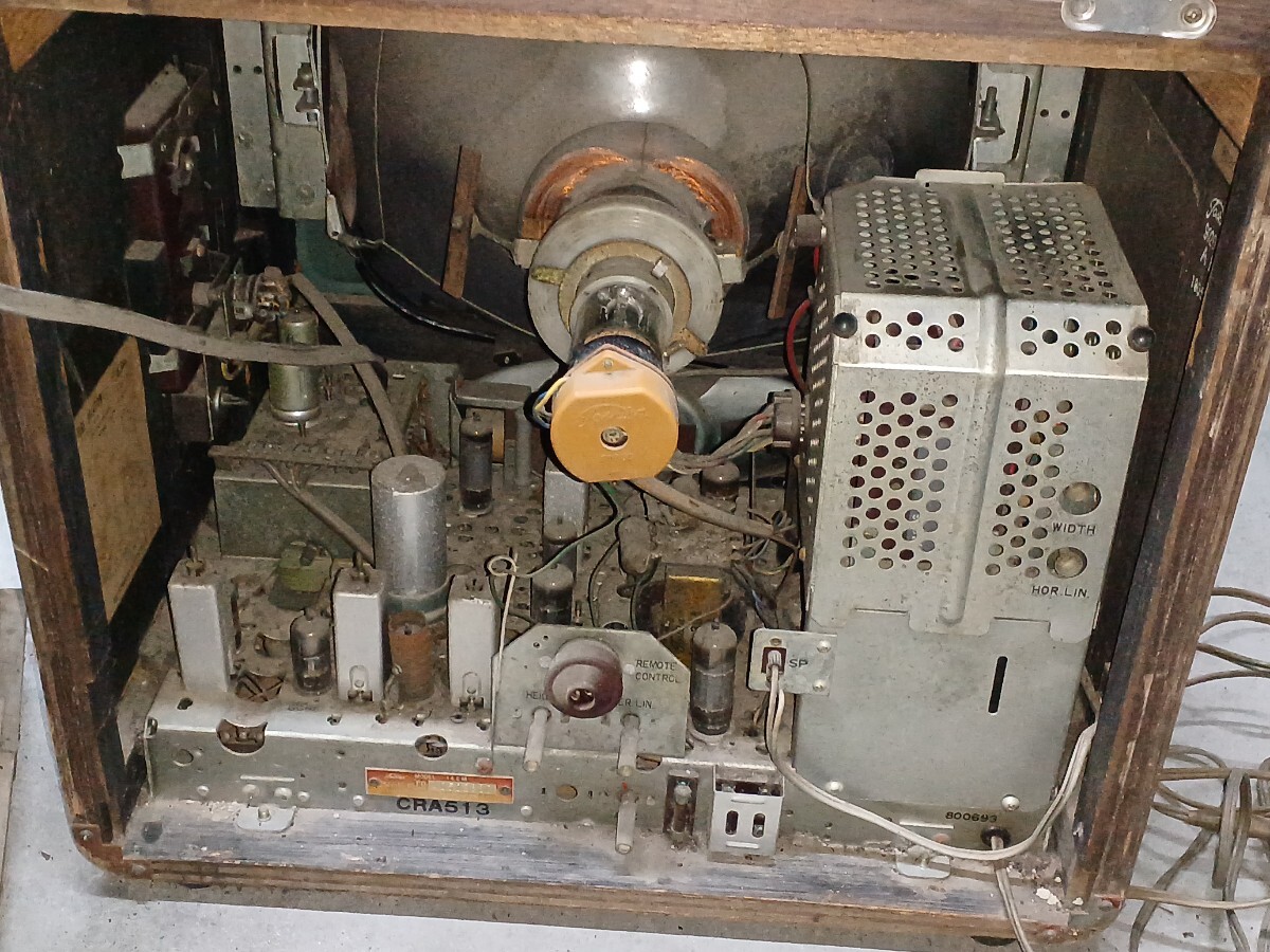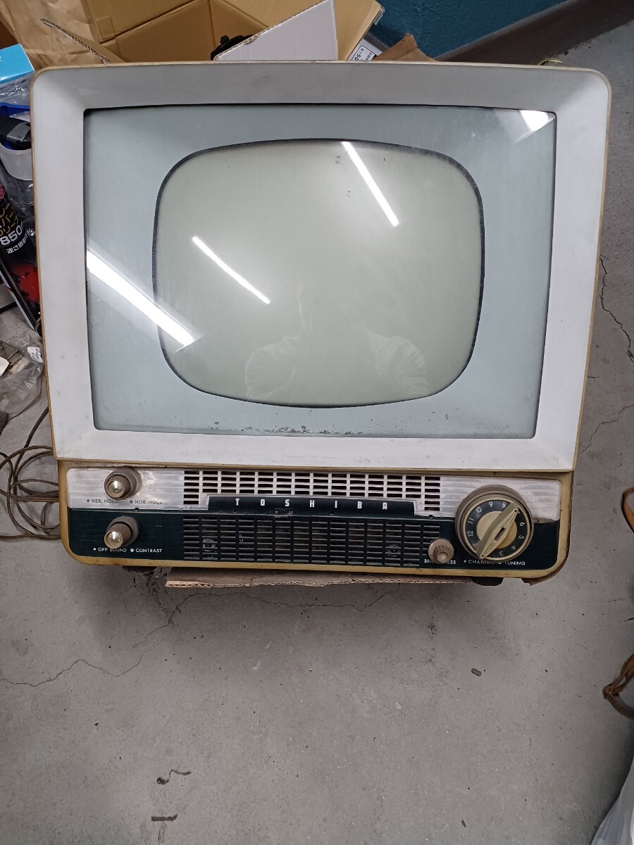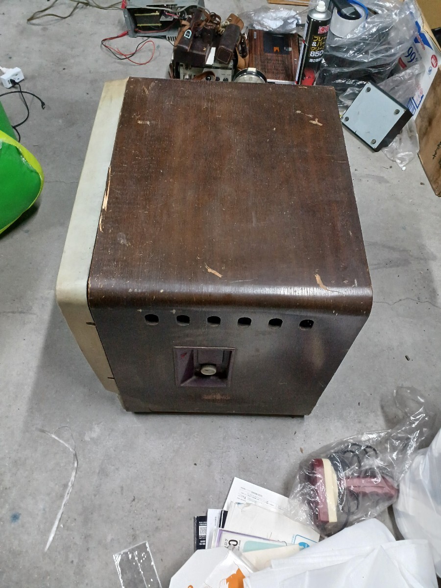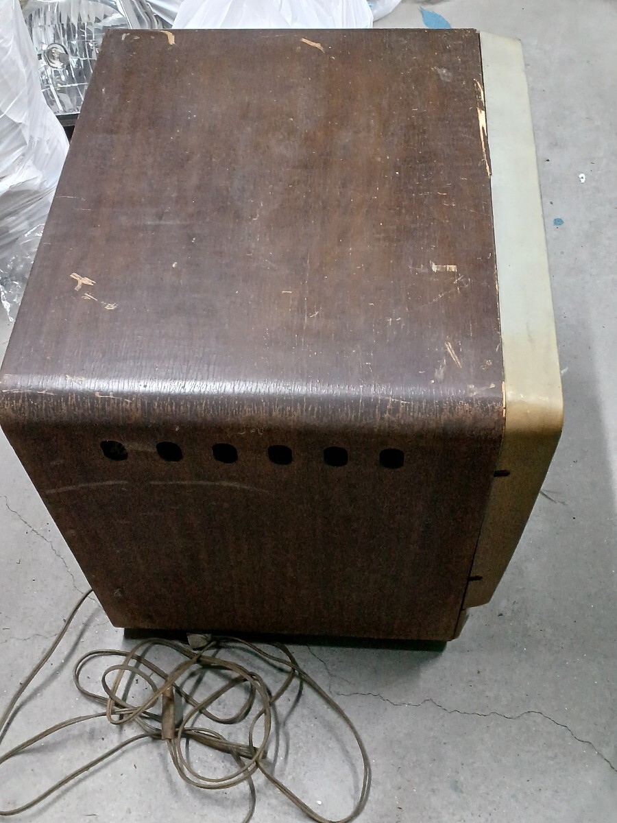 東芝真空管テレビです。倉庫保管してありました。コンセント入れてジーっと少し音出ましたが匂いがしたのですぐに抜きました。底は段ボールで加工してありますので画像確認お願いします。約19インチ位の大きさでした。中古品になりますので3nです。画像7のカバーのネジないのでネジ止めれば動きません。中古品になりますので3nです。140サイズです。