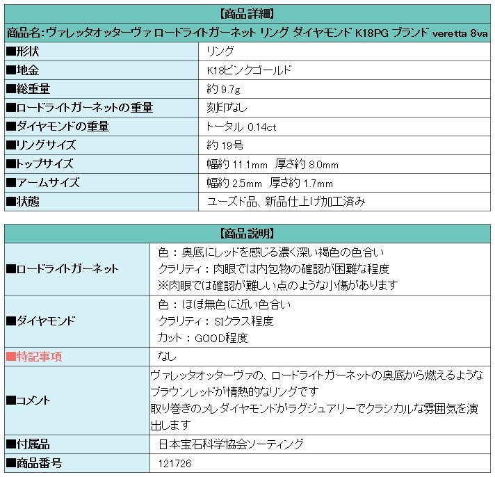 | 商品名:ヴァレッタオッターヴァ ロードライトガーネット リング ダイヤモンド K18PG ブランド veretta 8va | |