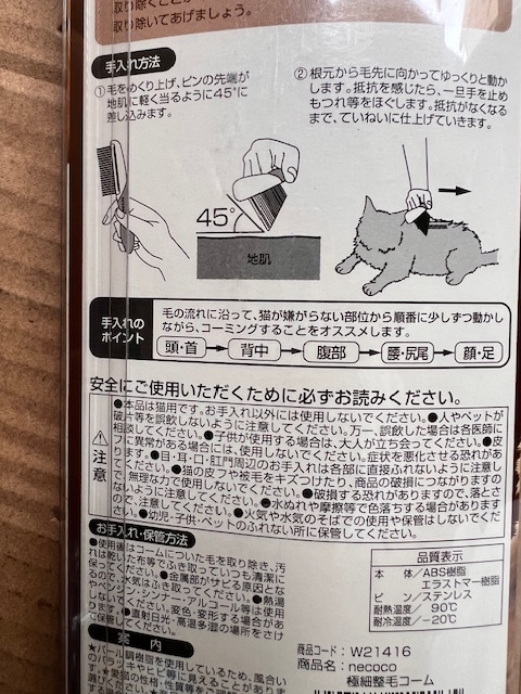 * 商品説明 * ◆定価1298円の商品 猫の細くてやわらかい被毛に入り込んで、ブラッシング時に取りきれなかった抜け毛を取り除いて毛並みを整えるコーム。 使いやすい柄付で持ち手はラバーグリップです。 材質は画像をご参照ください。 ※商品重量約47g 未使用新品です 処分品とご理解の上ノークレームノーリターンでお願いします。 | ||||||||