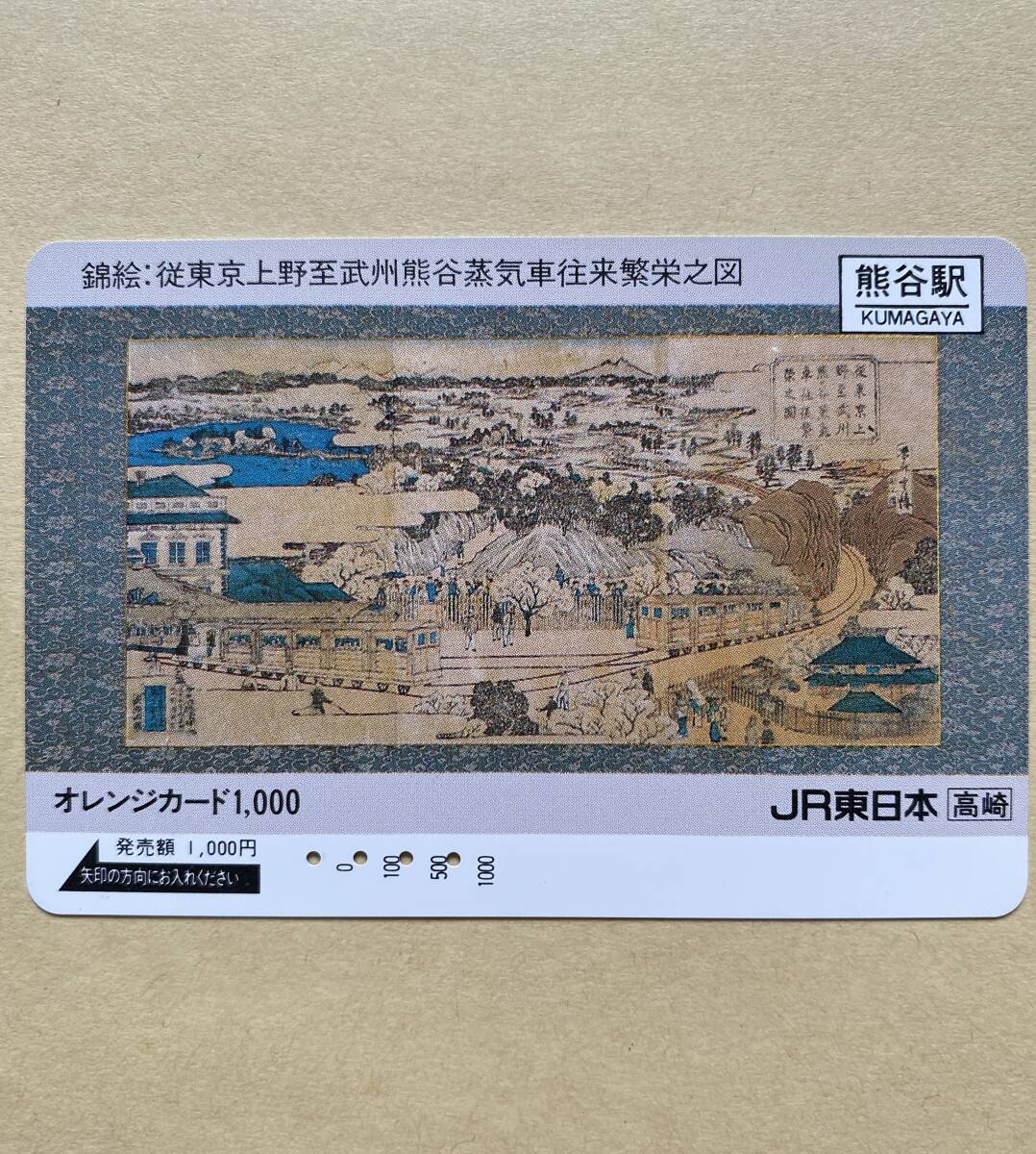 【使用済】 オレンジカード JR東日本 錦絵:従東京上野至武州熊谷蒸気車往来繁栄之図