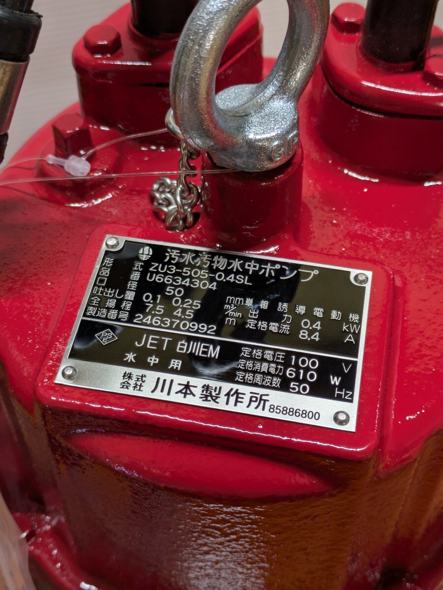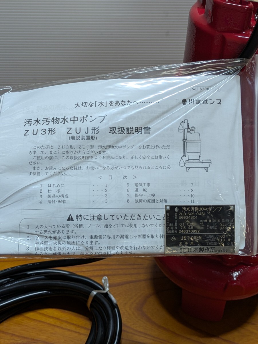 新品 水物水中ポンプ 川本ポンプ フランジタイプ ZU3形 汚水水中ポンプ 2極 50Hz 自動型 単相100V ZU3-505-0.4SL 動作確認済み