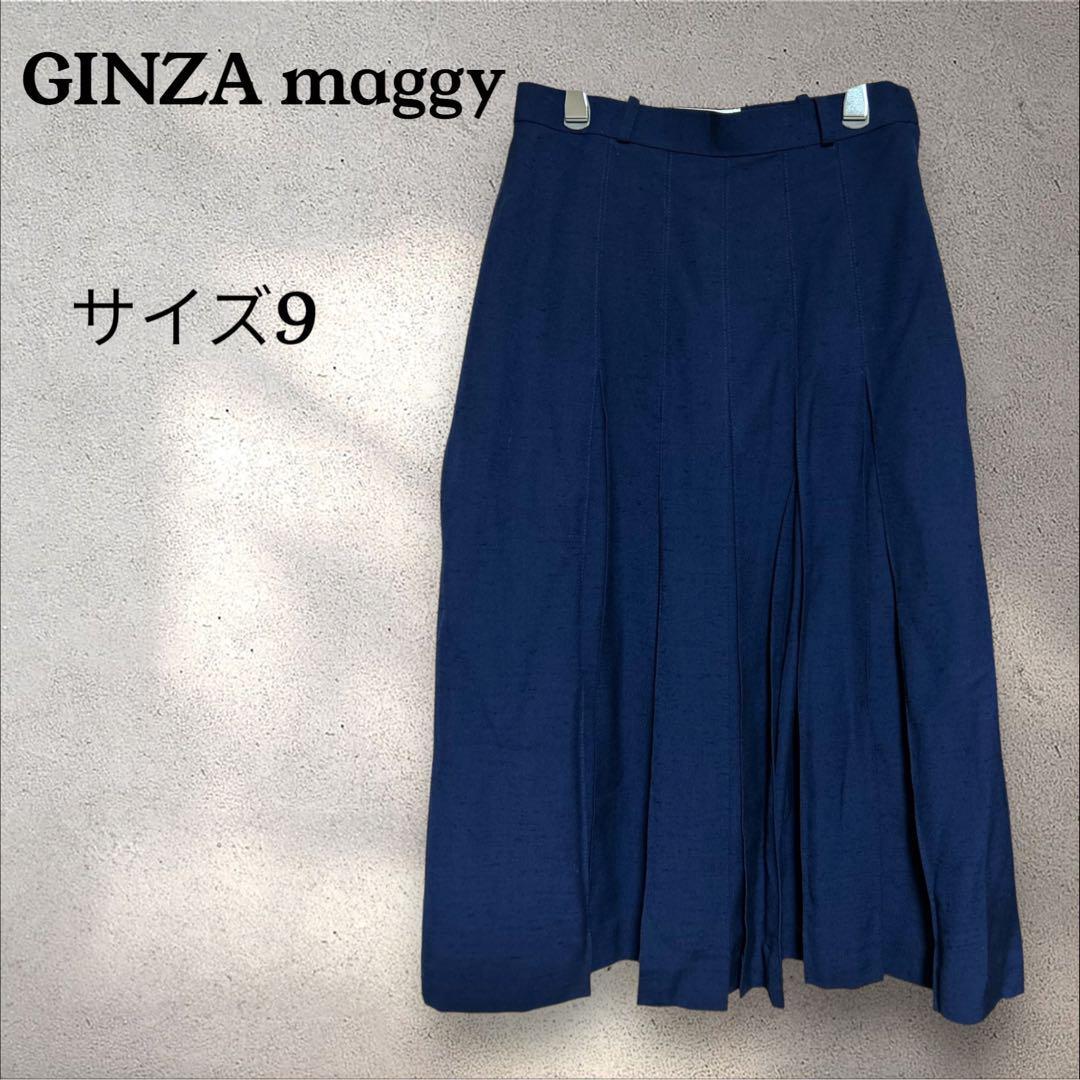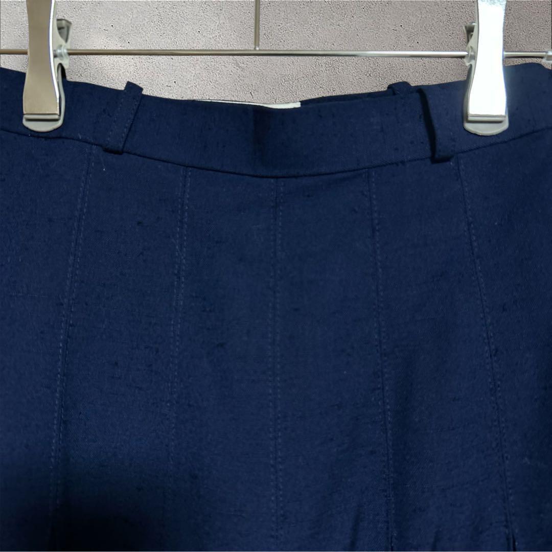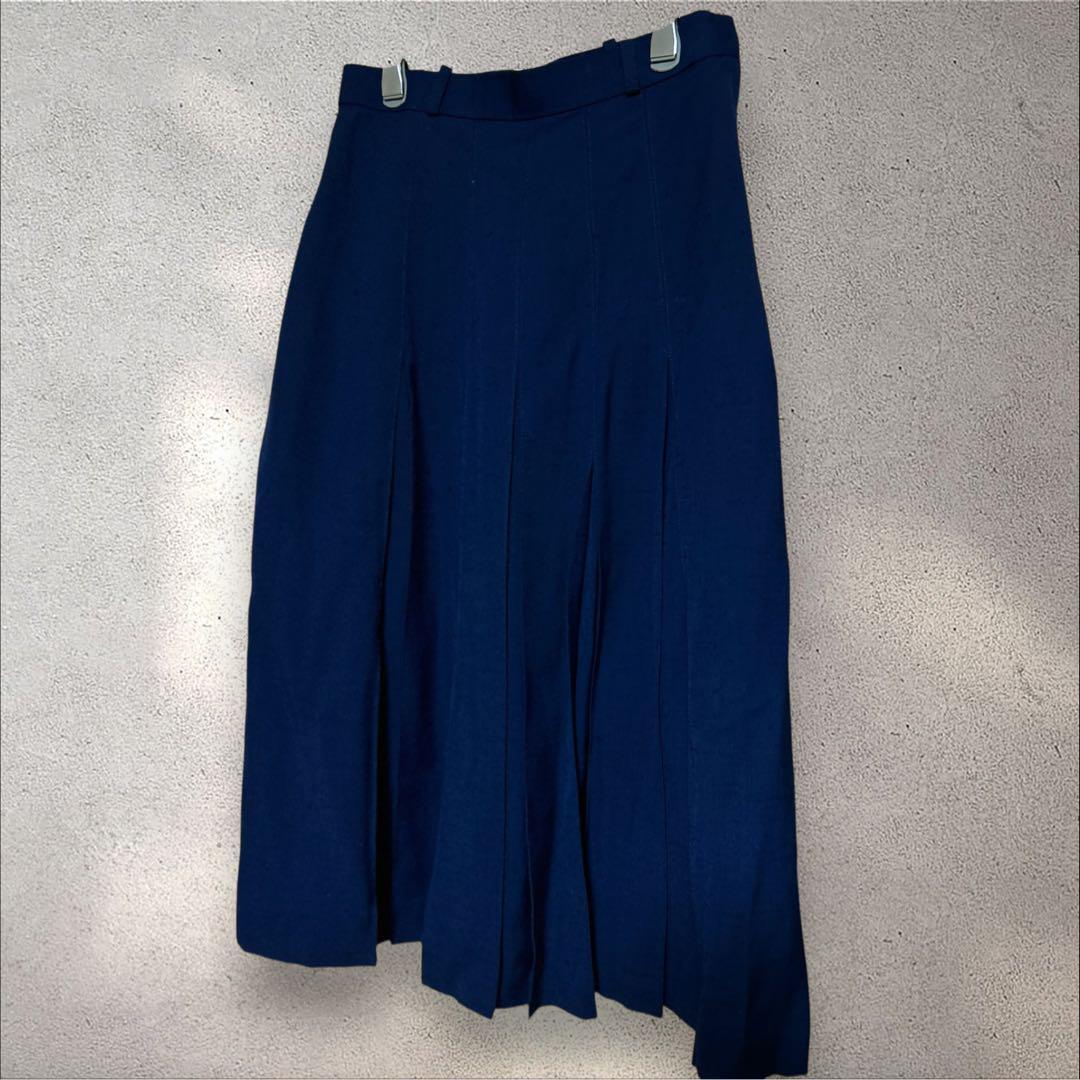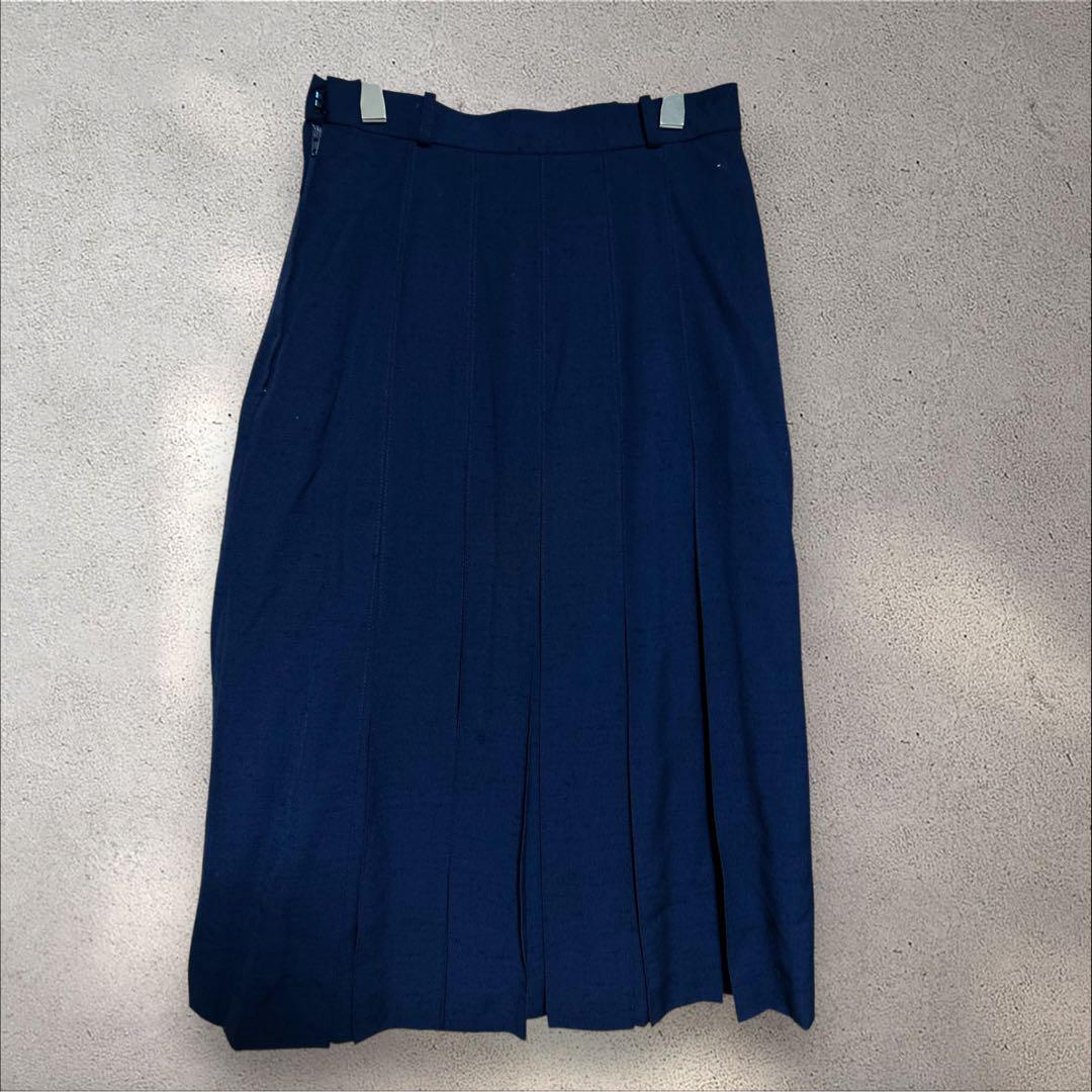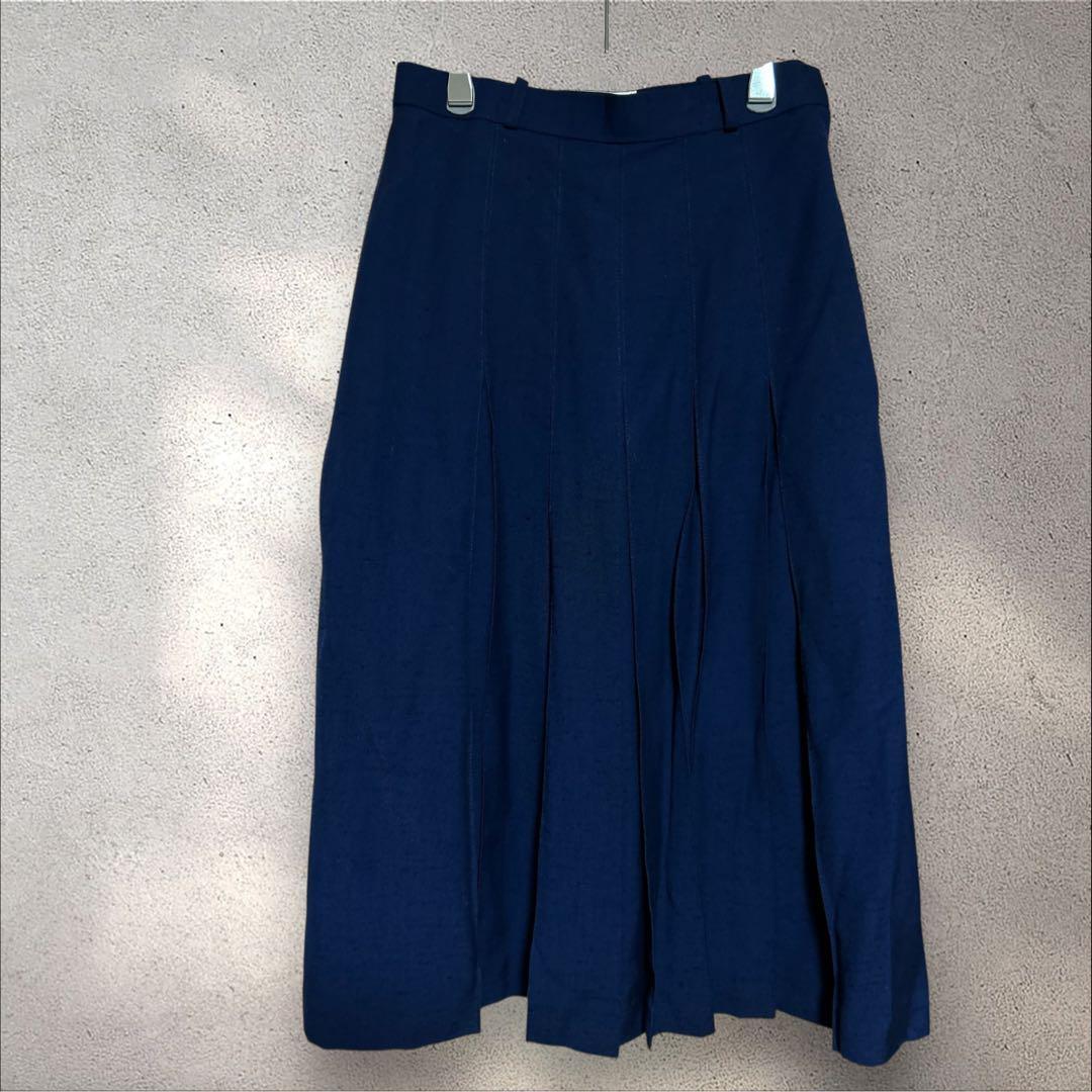 ネイビーのプリーツスカート。動くたびに揺れる上品なシルエットが魅力で、シンプルながらも洗練された印象に。サイズ9で、オフィスカジュアルにもぴったりのアイテムです。