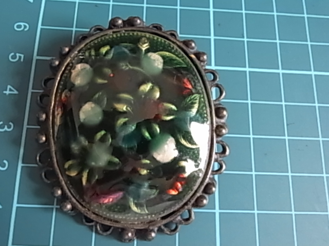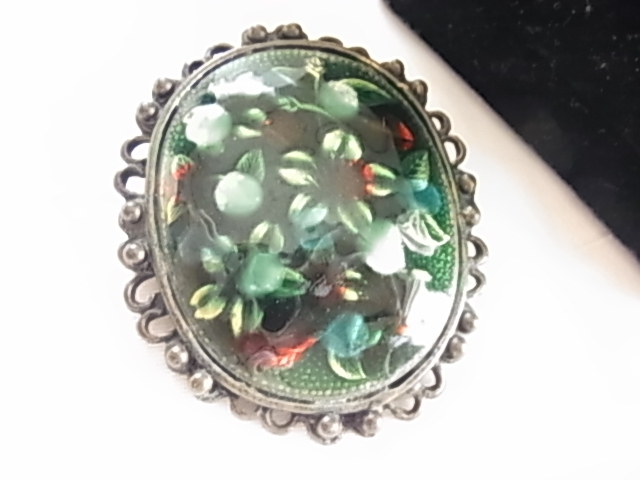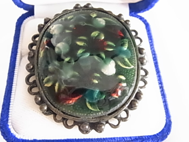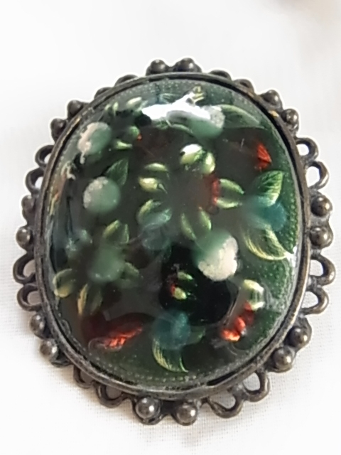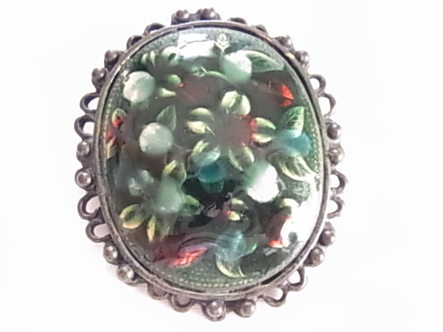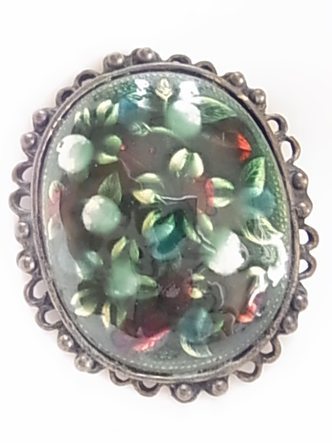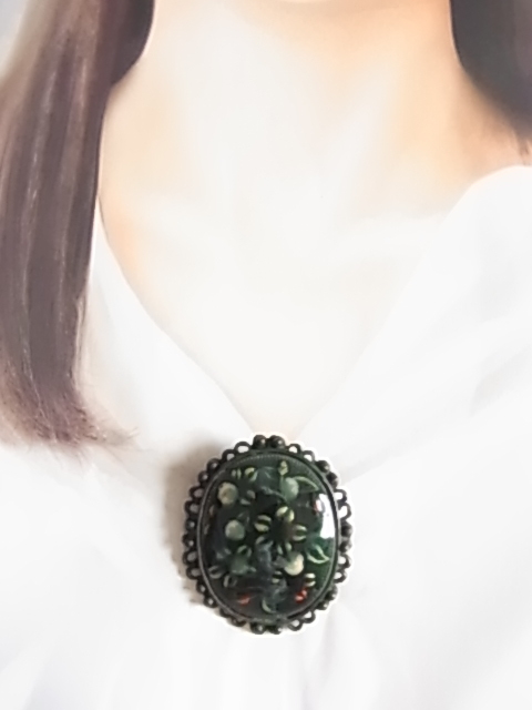 ▲ビンテージ/ヴィンテージ 焼き物系 七宝焼き?九谷焼?大き目存在感 インパクト グリーントーンにお花柄模様 和モダンブローチ