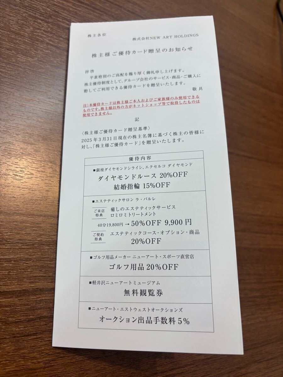 NEW ART 株主優待カード 銀座ダイヤモンドシライシ エクセルコ 15〜20%off 有効期限2026年3月末
