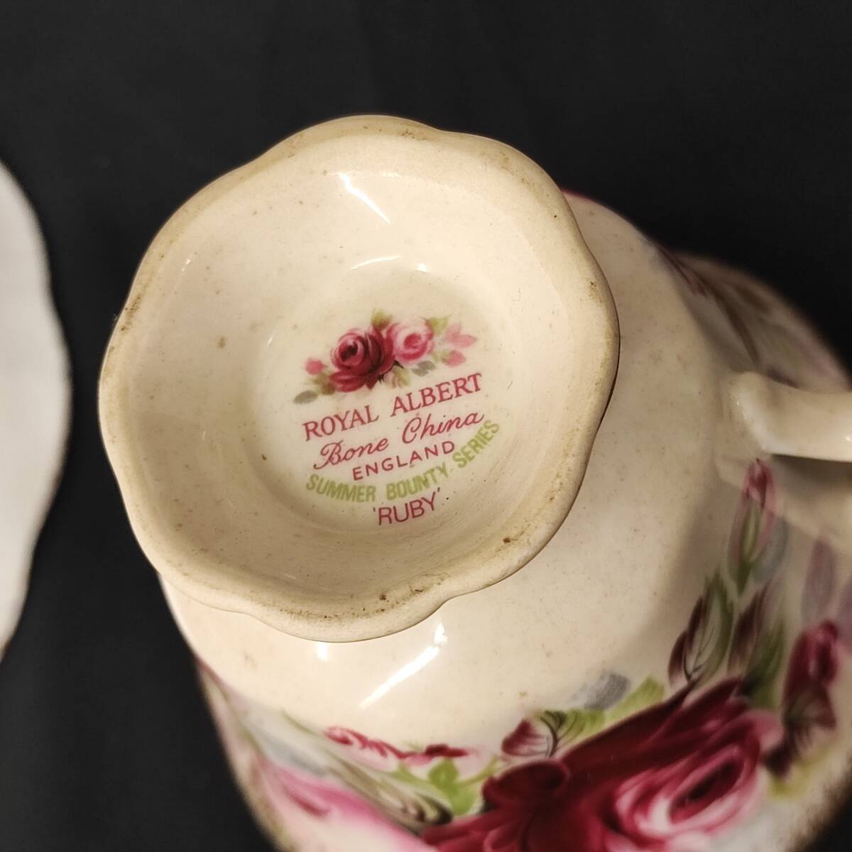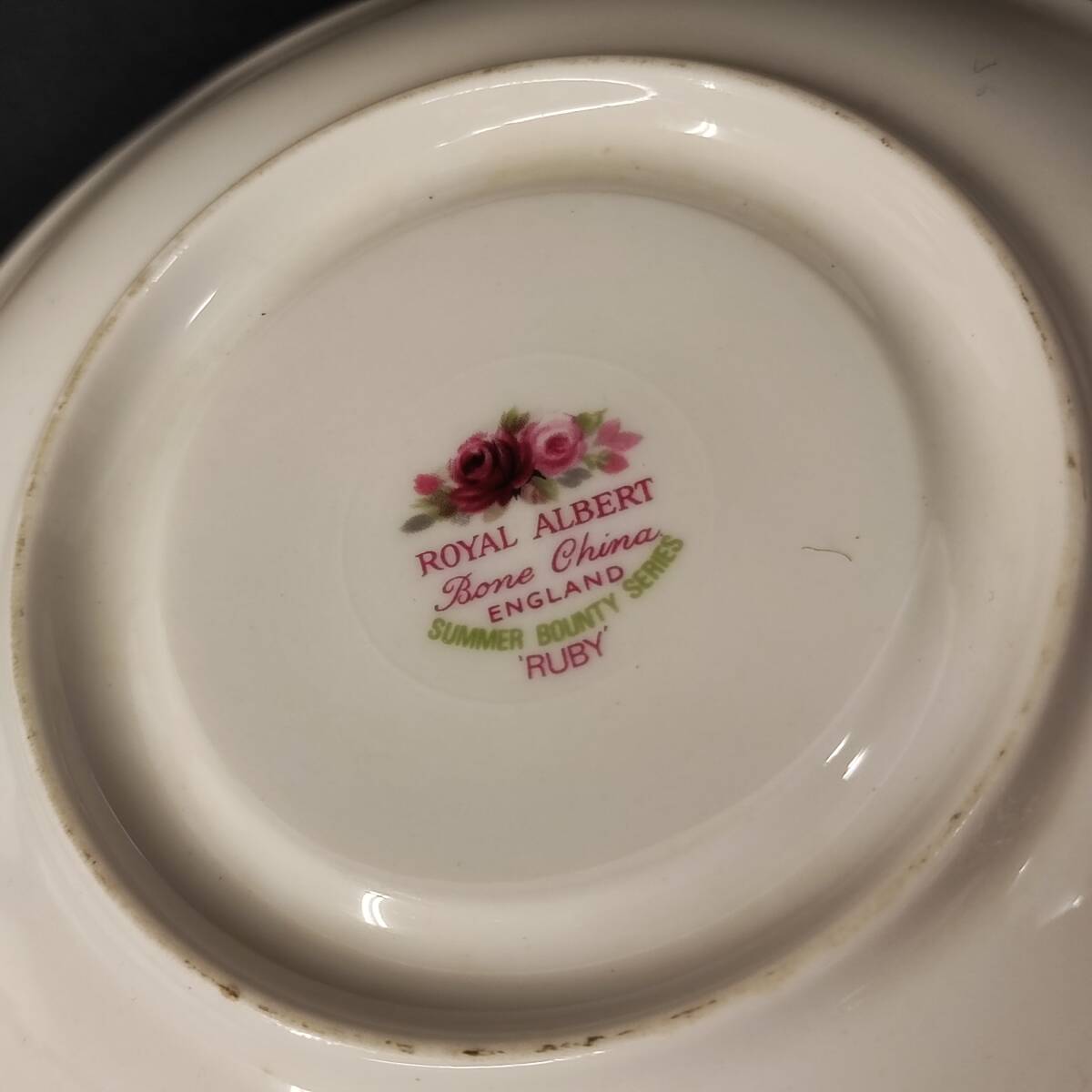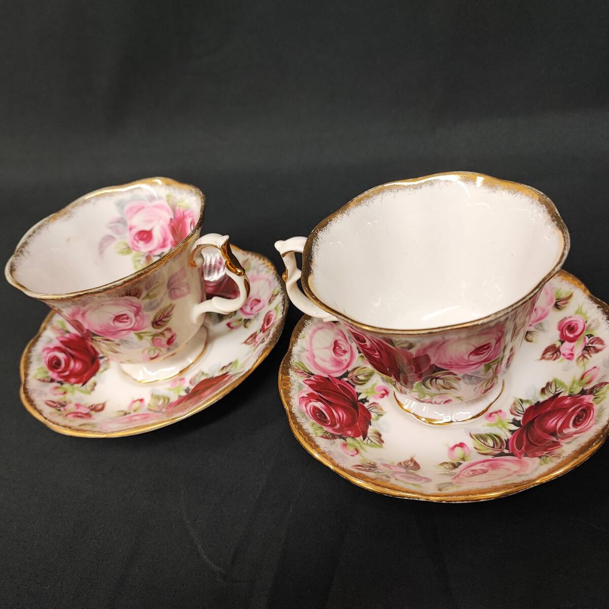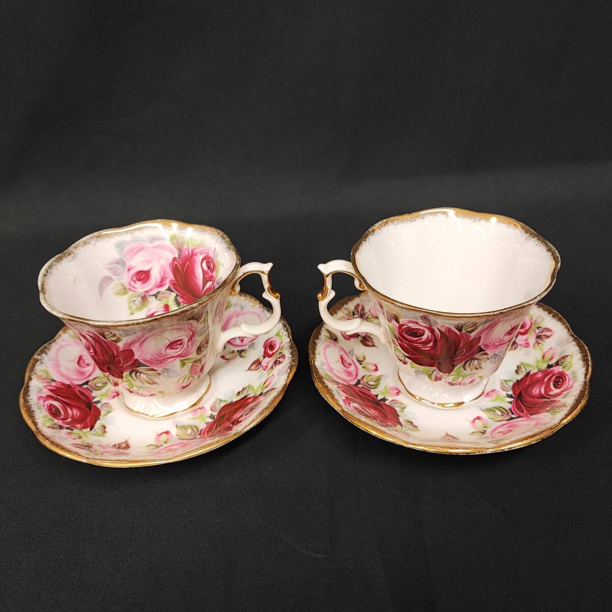 英国の名門ブランド Royal Albert ロイヤル アルバート 製、「Summer Bounty Series Ruby(サマー バウンティ シリーズ ルビー)」のカップ&ソーサー2客セットです。艶やかな赤とピンクのバラが美しく、縁取りには上品な金彩が施されたボーンチャイナ製の逸品。英国の伝統と気品が感じられるデザインで、ティータイムを華やかに演出してくれます。シリーズはすでに廃盤となっており、コレクターズアイテムとしても人気の高い商品です。状態も良好で、使用感はあるものの、ヒビや欠けなどの大きなダメージはございません。