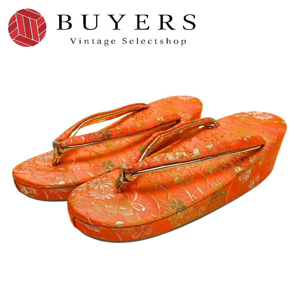 中古 草履 正絹(金銀糸除く) オレンジ 花柄 おしゃれ 和装 呉服 和服 きもの レディース 女性