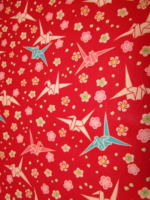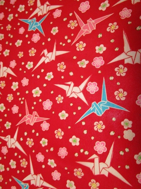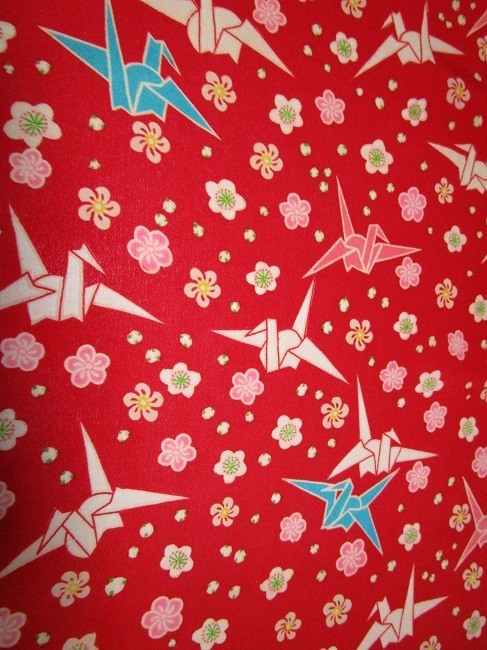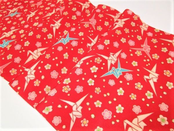 B-75★赤地*折鶴*梅*小花*正絹*古布はぎれ★文化人形/一閑張り/吊るし雛/市松人形/アンティーク