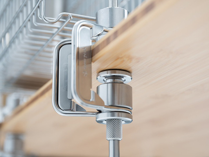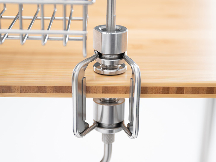 基本となるクランプを使用することで、様々なオプションを上下に接続することで自分だけの空間をつくることが可能です。クランプは、設置板厚:1~35mmまでの幅広い板厚に対応しており、IGT(アイアングリルテーブル)はもちろん、マルチファンクションテーブルやワンアクションテーブルにも接続することができます。テーブルアーキテクトシリーズのオプションと組み合わせることで、立体的にテーブルスペースを整理することができ、卓上にツール類が散乱せず、コンパクトなスペースで機能的で整頓されたコックピットのような空間を自由に作り上げることができます。