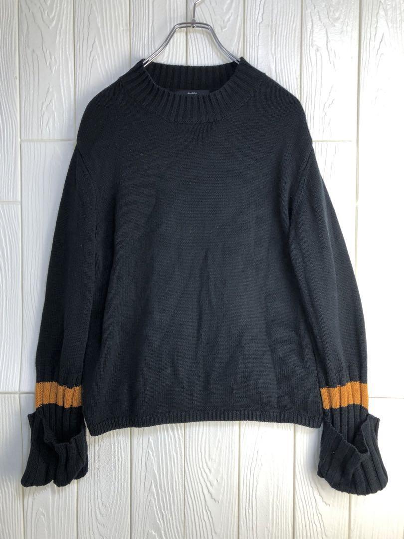 フリル付きの黒いニットセーター、オレンジのアクセントが特徴。