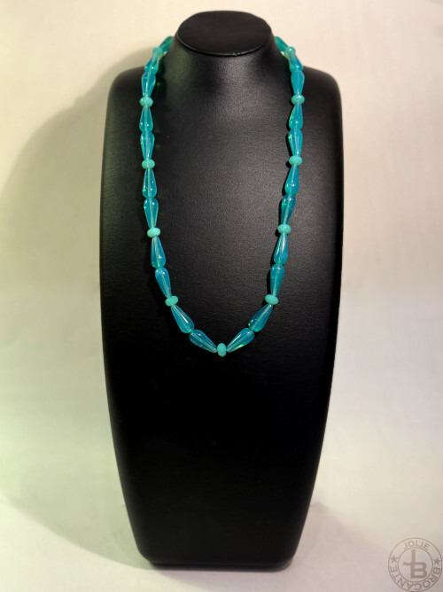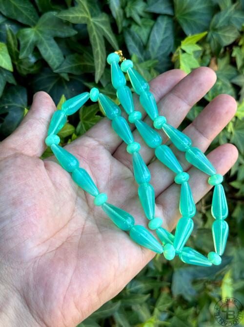 ヴィンテージガラスのウランガラスのビーズをつなぎ合わせたネックレス。