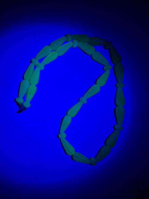 ウランガラス部分は紫外線が当たると蛍光に輝きます。