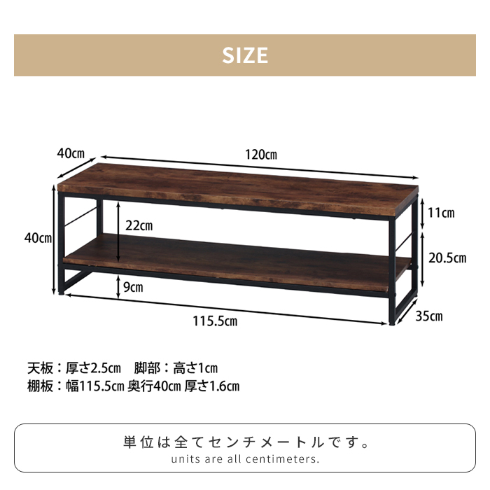 | [全体]幅120×奥行40×高さ40cm [天板厚]2.5cm [棚板厚]1.6cm [脚部高さ]1cm |