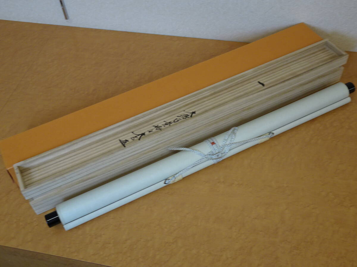| 長さ 約113.5センチ 幅 約71.2センチ(表装まで) 約76.6センチ(軸先まで) 状態 僅かなシミはありますが、目立つ傷もなく良い状態です。 軸先 真塗 箱は経年のシミ、すれあります。 | |||