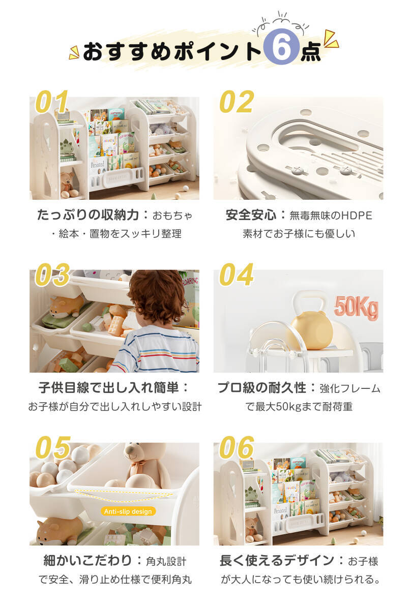 • 【省スペースでたっぷりの収納力】お子さんのおもちゃや本を整然と片付けられ、家の収納問題を一気に解決!生活空間を清潔に保つのに最適!