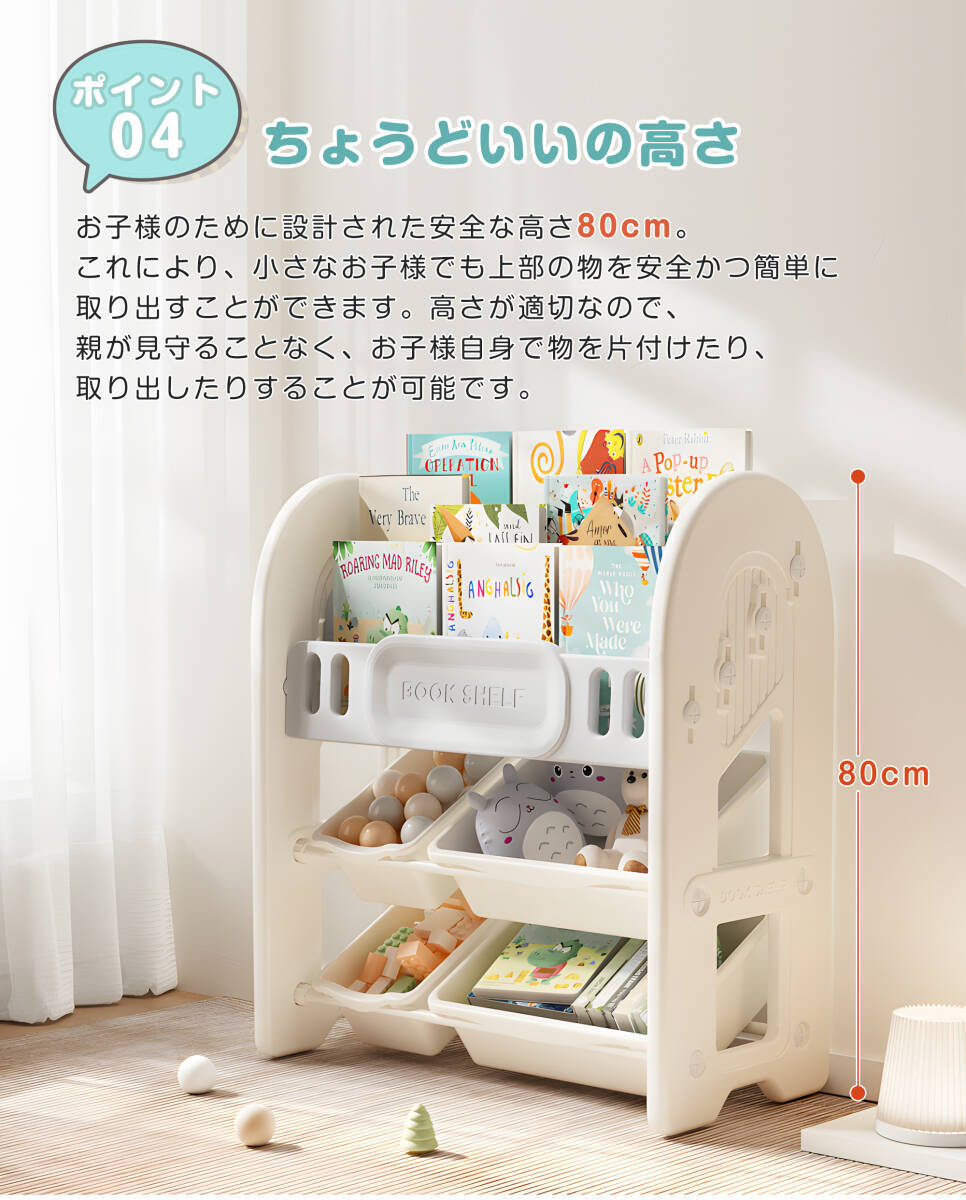 • 【ちょうどいいの高さ】お子様のために設計された安全な高さ80cm。これにより、小さなお子様でも上部の物を安全かつ簡単に取り出すことができます。高さが適切なので、親が見守ることなく、お子様自身で物を片付けたり、取り出したりすることが可能です。