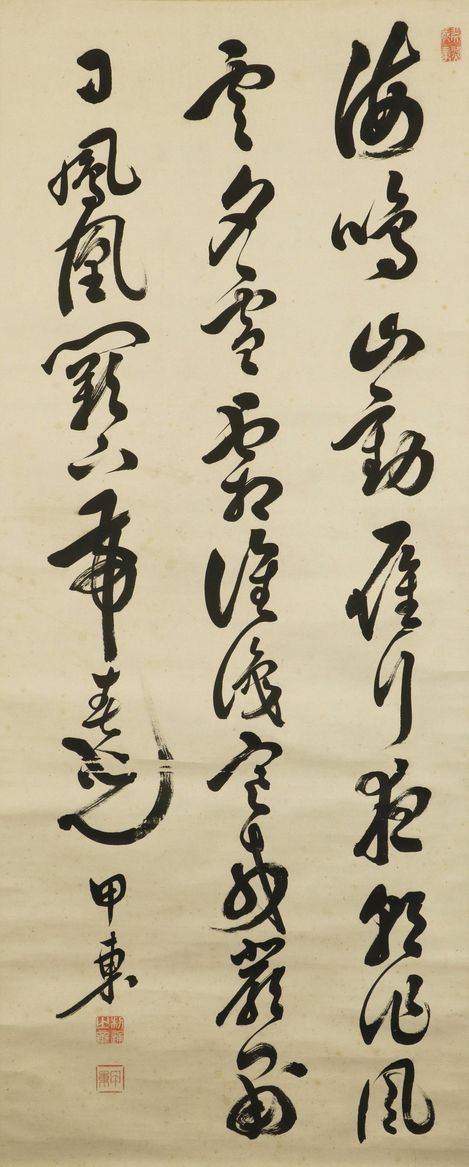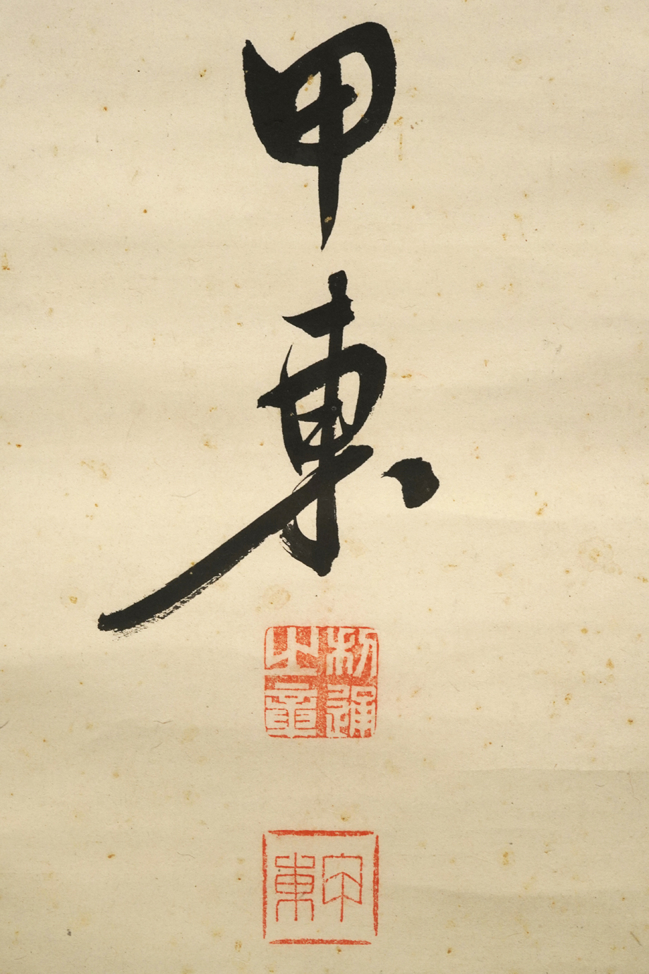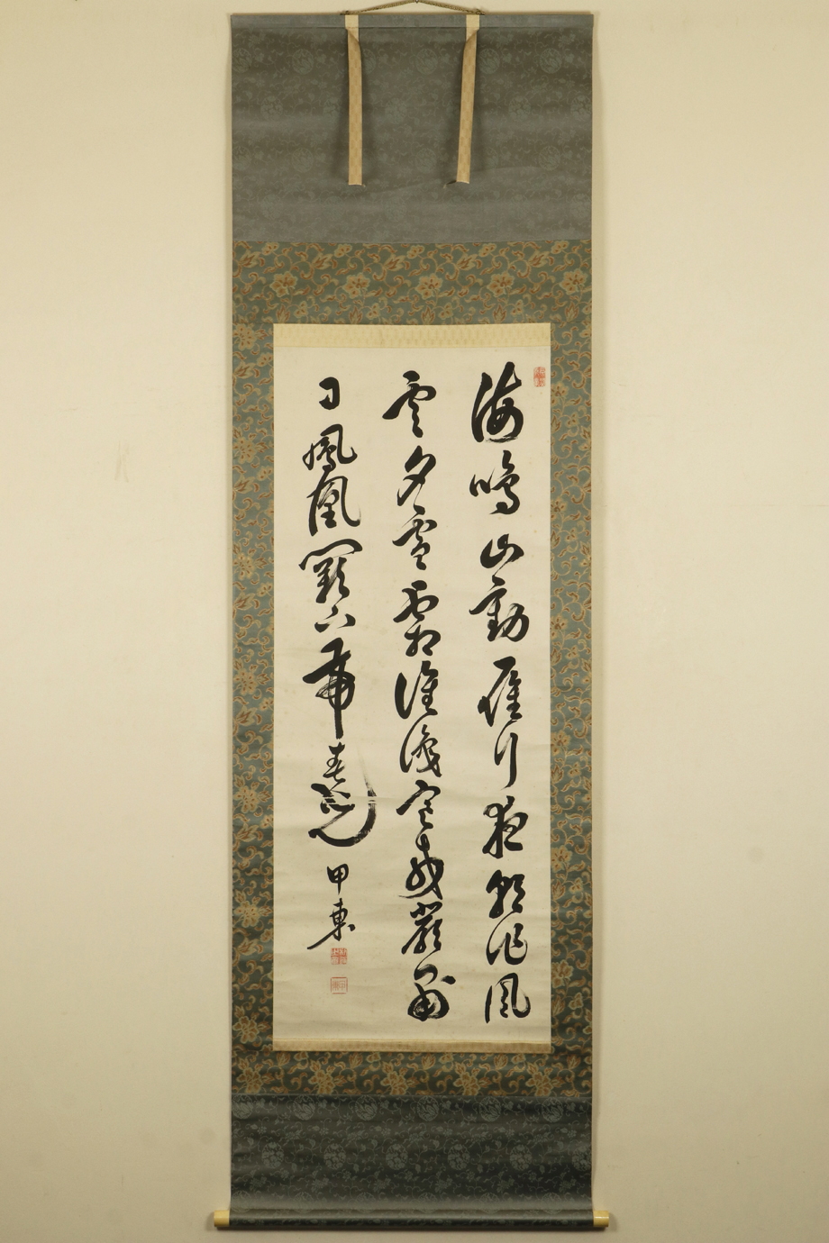 総丈サイズ…横 66 × 縦 223.5 cm 紙本・二重箱入 野村素軒箱書並極 状態…微少オレ 本紙少シミ・微少汚レ 箱微少傷ミ 【印刷ではありません】 【真作】 大久保甲東(利通) 幕末~明治の武士、政治家。薩摩生。初名は利済、のち利通。通称は正助、のち一蔵。号は甲東。西郷隆盛、岩倉具視らとともに討幕運動の中心となって王政復古の指導的役割を果たし、明治政府を樹立させた。維新後は参議となって廃藩置県・版籍奉還を行い、また明治4年には大蔵卿となって岩倉遣外使節団副使として外遊するなど、明治政府の中心人物として活躍した。「維新の三傑」「維新の十傑」の1人。東京紀尾井坂で石川県士族島田一良らに暗殺された。明治11年(1878)歿、49歳。 野村素軒 幕末から昭和初期にかけての書家・政治家。周防生。名は素介。字は絢夫。はじめ萩の明倫館で学び、のち江戸に出て儒学者塩谷宕陰、書家小島成斎に学んだ。維新後は茨城県令、文部大書記官、元老院大書記官、元老院議官などを歴任した。貴族院議員、男爵。書に秀で、明治の三筆の一人として知られる。昭和2年(1927)歿、86歳。 |
