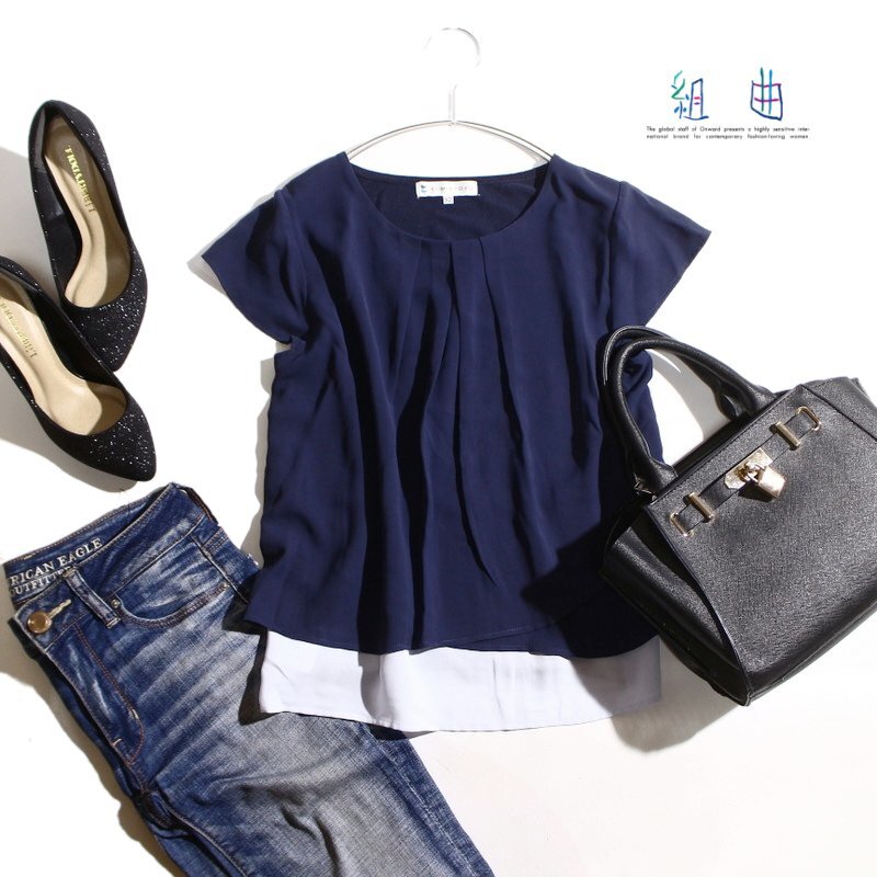 美品 組曲 クミキョク 株) オンワード樫山 夏 上品 フェイクレイヤード タック シフォン 半袖 カットソー ブラウス ネイビー 紺 S2 通勤