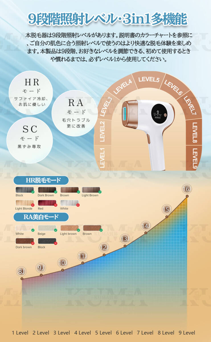 【9段階調節・家庭用99万発照射】本脱毛器は9段階照射レベルがあります。説明書のカラーチャートを参照に、ご自分の肌色に合う照射レベルで使うのはより快適な脱毛体験を楽しめます。本製品は9段階、お好きなレベルを調節できる、初めて使用するときや慣れるまでは、必ずレベル1から使用してください。99万照射回数があり、一人での使用なら、40年以上が使用できます。家族や友人と一緒に使用することもでき、家族には1つで十分です。<br>