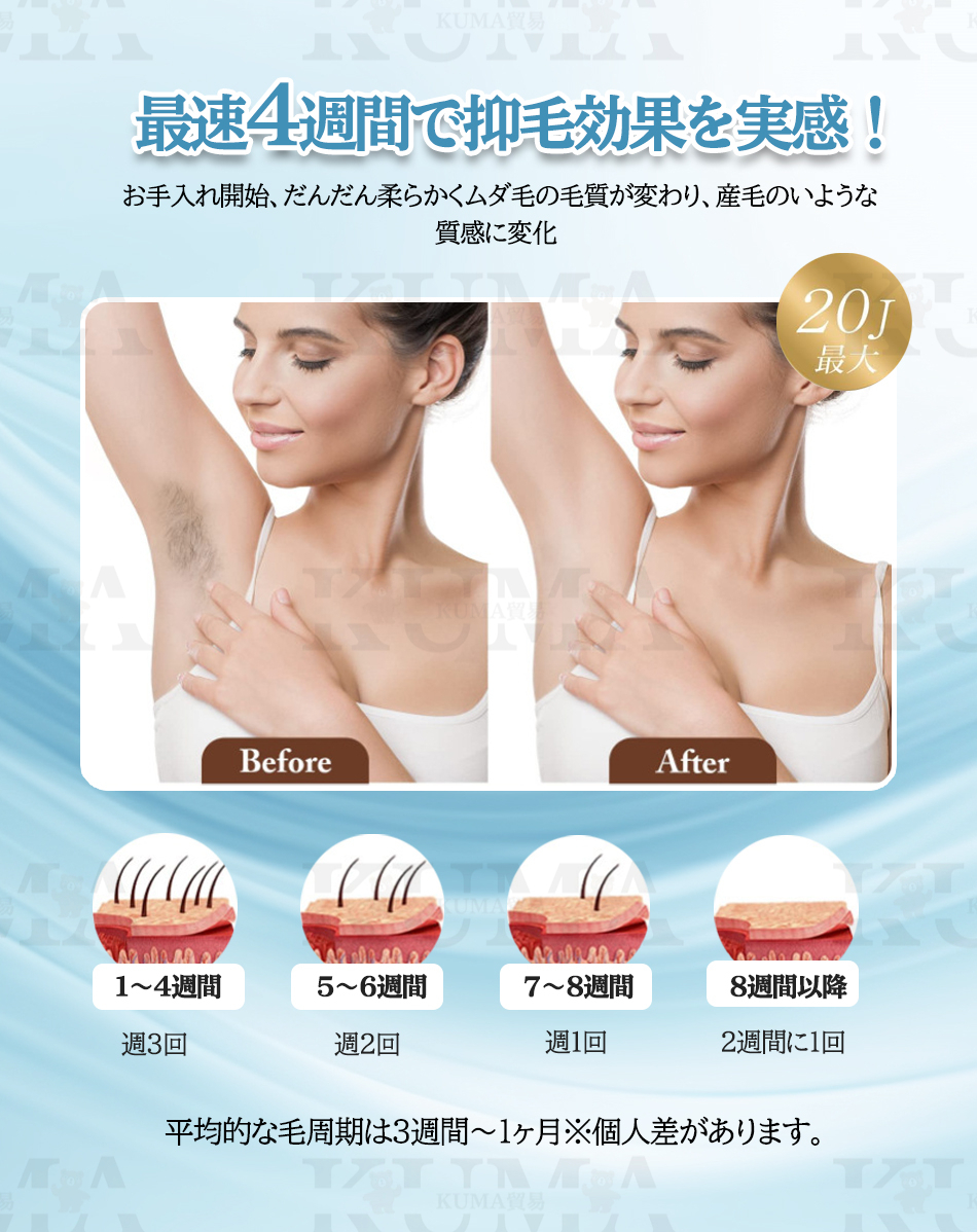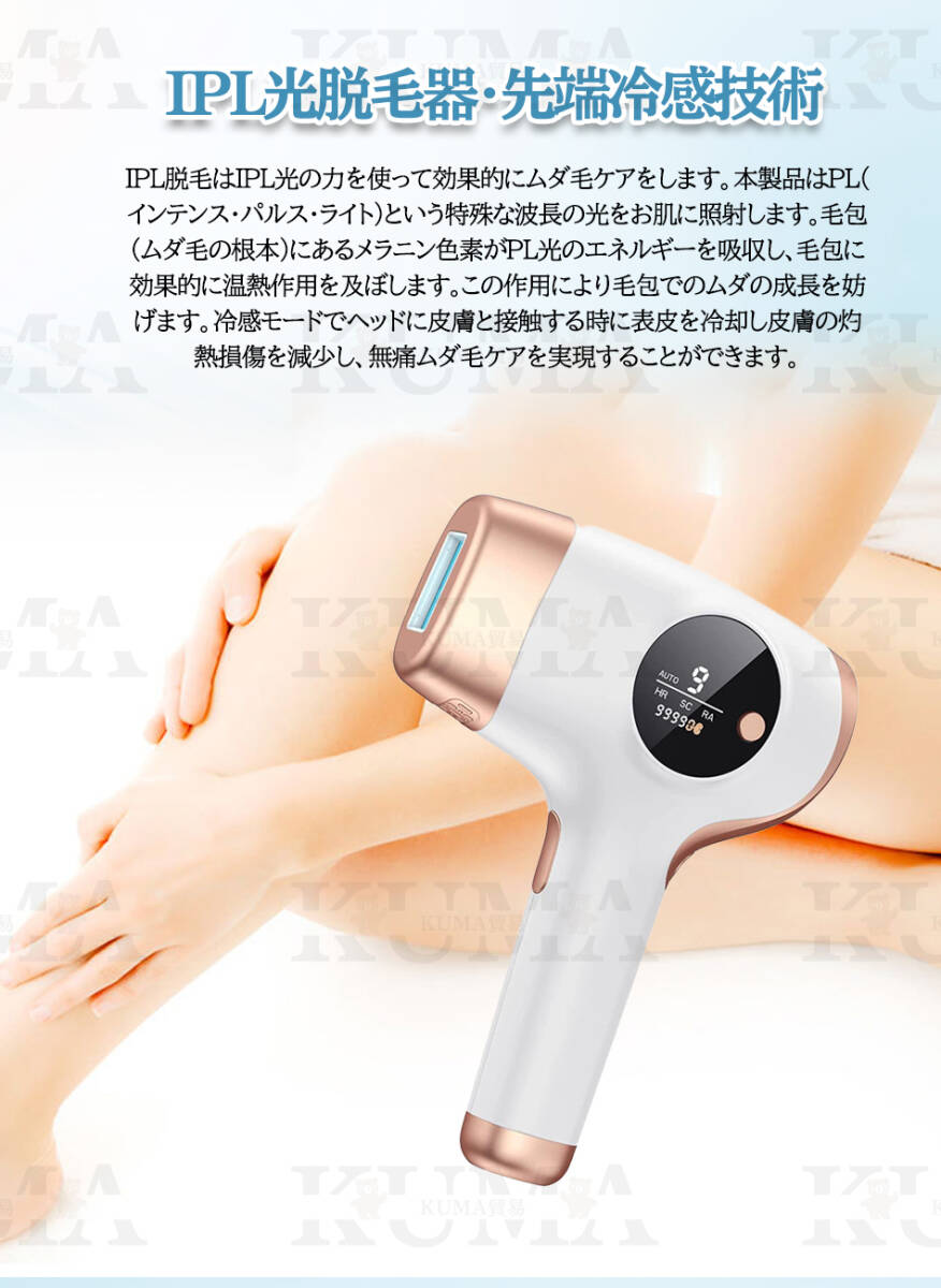 【IPL光脱毛器・先端冷感技術】IPL脱毛はIPL光の力を使って効果的にムダ毛ケアをします。本製品はPL(インテンス・パルス・ライト)という特殊な波長の光をお肌に照射します。毛包(ムダ毛の根本)にあるメラニン色素がPL光のエネルギーを吸収し、毛包に効果的に温熱作用を及ぼします。この作用により毛包でのムダの成長を妨げます。冷感モードでヘッドに皮膚と接触する時に表皮を冷却し皮膚の灼熱損傷を減少し、無痛ムダ毛ケアを実現することができます。冷感モードを使用すると、モードを切り替えてください。敏感な肌の人は、、冷感モードを使用することをお勧めします。<br>