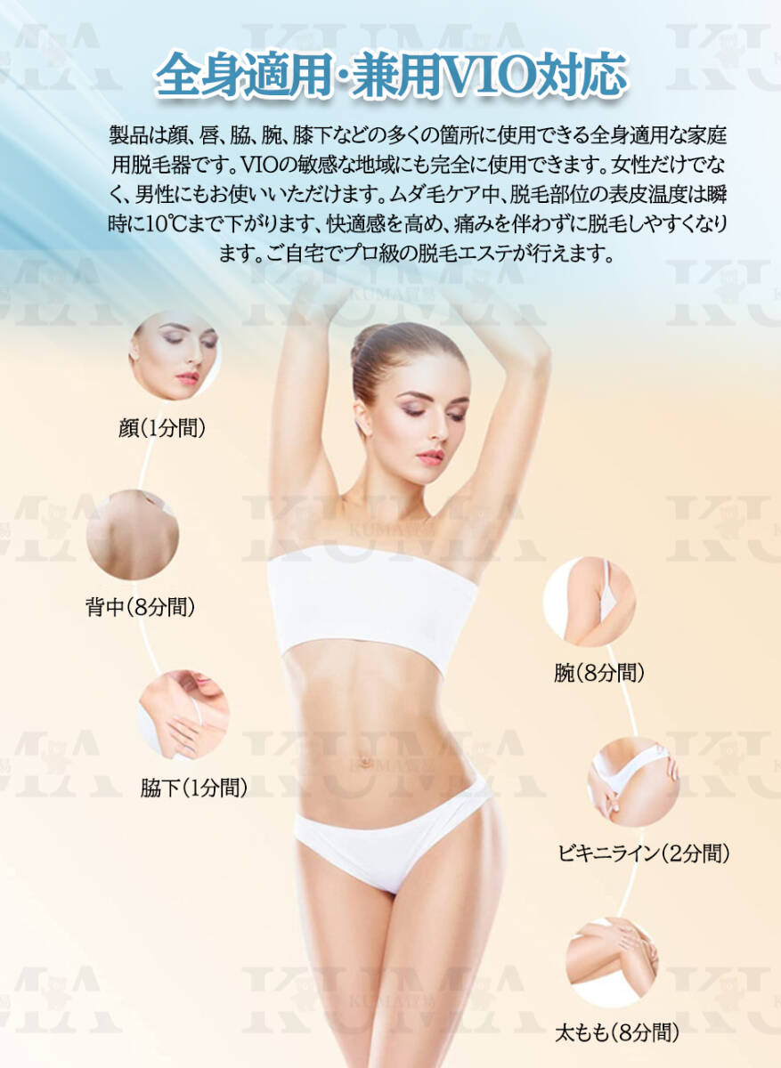 【全身兼用VIO対応・無痛脱毛体験】本製品は顔、唇、脇、腕、膝下などの多くの箇所に使用できる全身適用な家庭用脱毛器です。VIOの敏感な地域にも完全に使用できます。女性だけでなく、男性にもお使いいただけます。ムダ毛ケア中、脱毛部位の表皮温度は瞬時に10℃まで下がります、快適感を高め、痛みを伴わずに脱毛しやすくなります。ご自宅でプロ級の脱毛エステが行えます。<br>