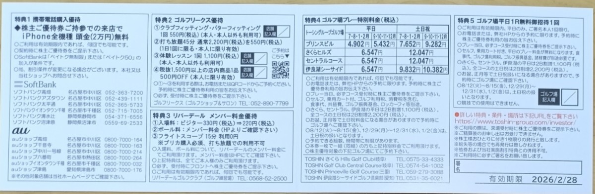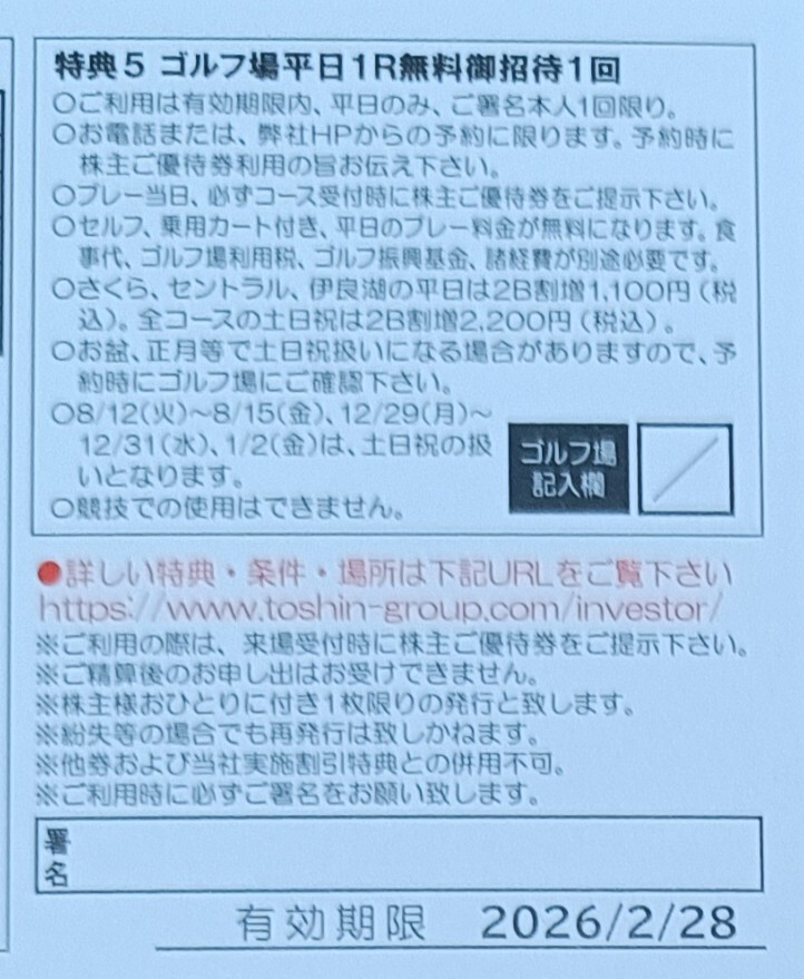 【送料込み 即決】トーシン TOSHIN 株主優待券 ゴルフ場平日1R無料招待券(2026年2月28 日まで)