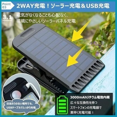 【新品送料無料】Saiveina センサーライト ソーラーライト屋外 人感 防水 ソーラー クリップ式 太陽光充電USB充電 3000mAh大容量電池