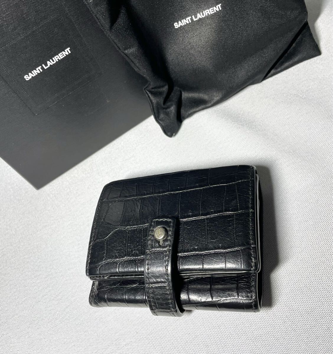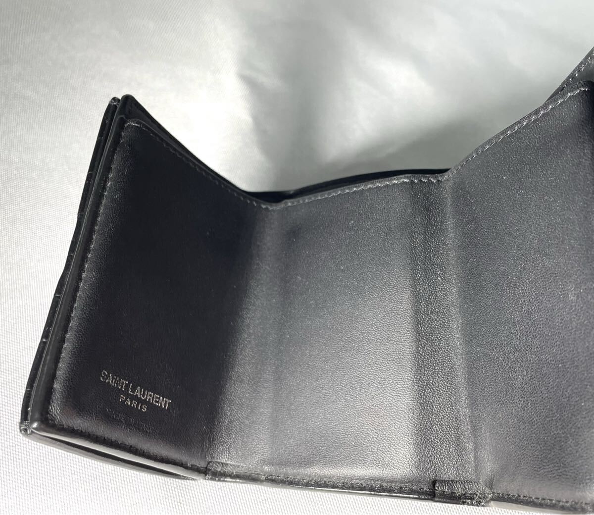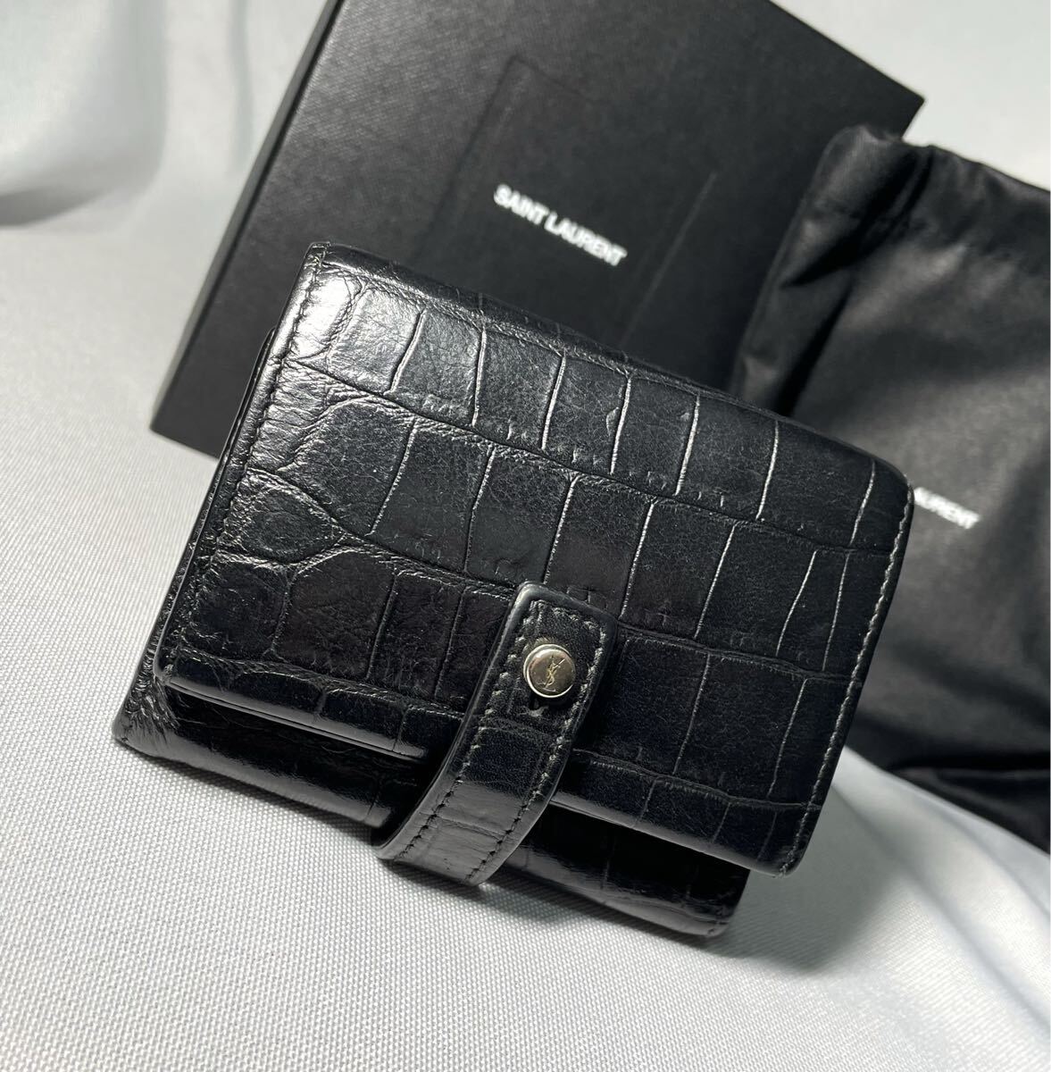 即決美品 Saint Laurent Paris サンローランパリ 三つ折りレザー財布 黒 YSL クロコダイル 型押し コンパクトウォレット 付属あり