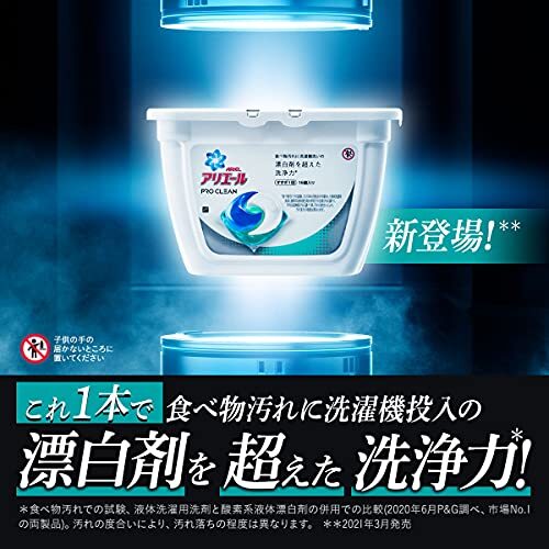 商品紹介 アリエール PRO CLEAN 洗濯洗剤 超特大サイズ 通常の約1.6倍 アリエールジェルボール本体(16個入り)対比 食べ物汚れに洗濯機投入の漂白剤を超えた洗浄力で一発洗浄 *1 これまで諦めていた食べ物汚れを一発洗浄 *2 最高量の洗浄成分を配合 *3 抗菌*4 すすぎ1回OK 全て平均洗濯物量(P&G調べ)時。 洗う量が増えたら2個使いも 縦型洗濯機 ドラム式洗濯機OK *1 食べ物汚れでの試験(詳細はwebへ)。2020年6月時点の市場No.1液体洗濯用洗剤とNo.1酸素系液体漂白剤の併用での比較(P&G調べ)。汚れの度合いにより、汚れ落ちの程度は異なります。 *2 消費者データによる。汚れの度合いにより、汚れ落ちの程度は異なります。 *3 アリエールジェルボールとの比較 *4 すべての菌の増殖を抑えるわけではありません。・使用上の注意 使用上の注意 これは食べ物ではありません。 子供やペットの手の届く所に置かない。 口に入れたり、飲み込んだりしない。 認知症の方などの誤飲を防ぐため、置き場所に注意する。 用途以外に使わない。 下洗いや手洗い用におすすめしません。 製品を強く押したり、長時間触らない。 製品が破れて原液が洗濯機のフタについたときは、水ですぐふき取る。 切り口や角で手を切らないようご注意ください。 応急処置 万一飲み込んだ場合は、吐かせず、水を飲ませるなどの処置をして、医師に相談する。 目に入った場合は、こすらずにすぐ水で充分に洗い流して、医師に相談する。 万一製品が皮膚や衣類に残った場合は、皮膚は水でよく洗い、衣類はぬるま湯にしばらくつけ置きしもみ洗いをしてください。