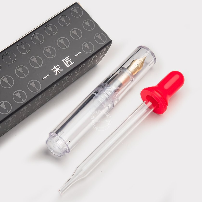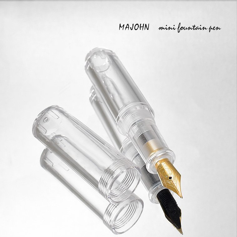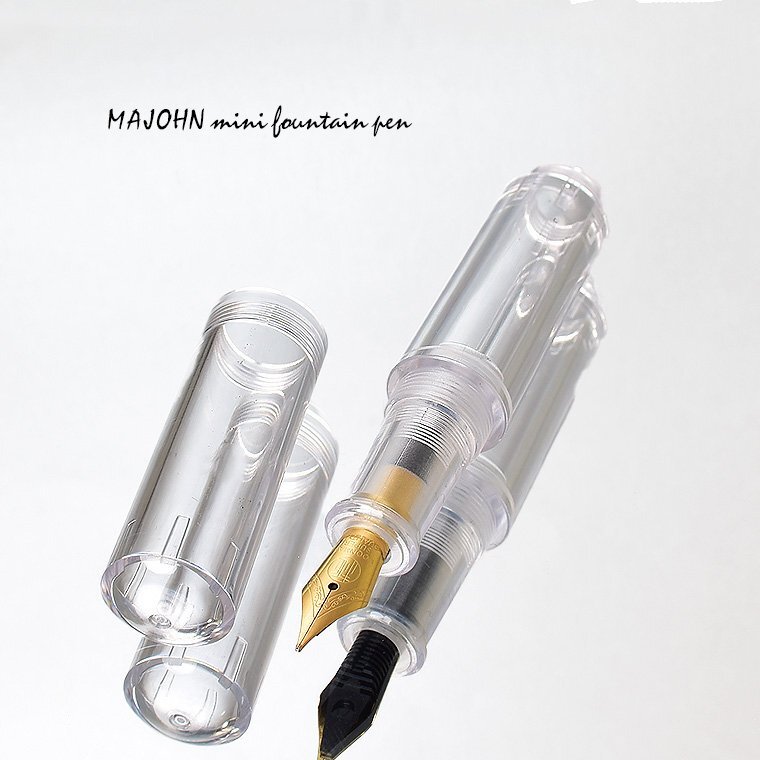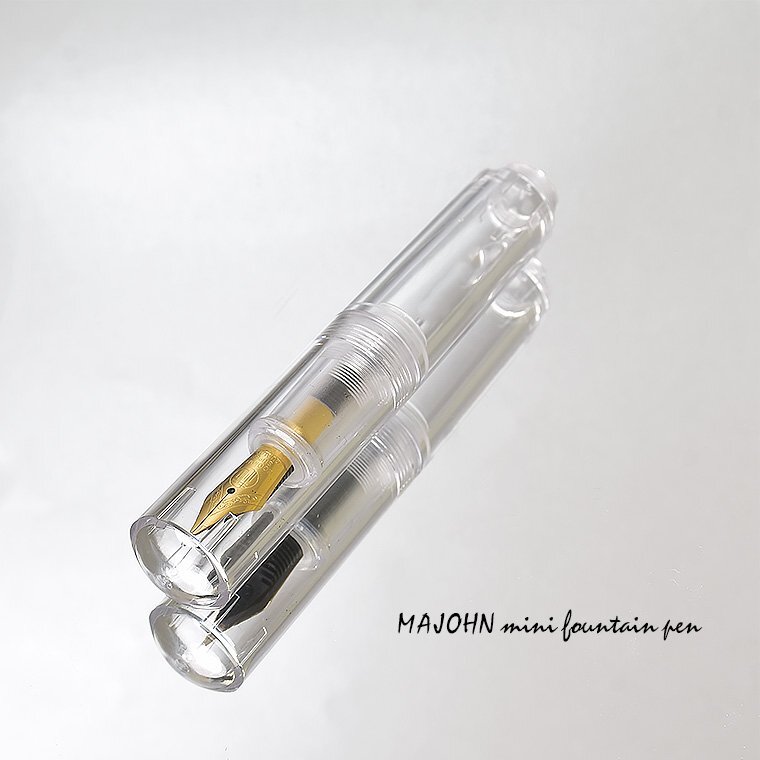 | 【MAJOHN/未匠】 待望の新作!! ポケットサイズ ミニ万年筆 カートリッジ式・アイドロップ式(両用) トランスペアレンシー透明1本での出品 ペン先:EF(極細) ![]() ※当ページ内の写真はすべてサンプルです/セット販売ではございません 個体ごとにラメの入り方等が異なります(透明とブラックはラメなし) 中国の大手文房具屋店「上海晶典」のオリジナルブランド「MAJOHN」の ミニサイズ万年筆「Wancai/ワンサイ」 第2代をご紹介します。 コンパクトで持ち運びに便利なポケットサイズの万年筆。 ![]() 毎日使っているペンケース・バッグや、定番で着ている上着のポケットに、 「ワンサイ」万年筆を収納し、この万年筆で手帳・スケジュール帳にスラスラと書き込む。 ボールペンやペンシルではなく万年筆を使います。 それは、万年筆という筆記具は自分と向き合う時間を作ってくれる不思議な道具だから。 ゆっくりと流れる時間を感じながら心の声に耳を澄ませば、忙しい日常の中に置き忘れて しまった「自分らしさ」という、大切な宝物に気付くことができます。 ![]() *セット販売ではございません/透明(クリア)1本での出品です 「カートリッジ式」 インクが入っているカートリッジを、万年筆に装着するだけで手軽に書ける一般的な 方法です。 新しい万年筆の場合、インクがすぐに伝わらない事がございますので、カートリッジの 中間を指で挟んで軽く押してください。 「アイドロップ式」 インクの入ったボトルインクから、付属のスポイドで万年筆の同軸へ直接入れて使う 方法です。 カートリッジ式に比べてインクの量も多く、ペン先の毛細管現象が働きやすいので インクフローがとてもスムーズです! ![]() <ミニサイズから最適な万年筆サイズへ> 収納時の全長は8.8cmと手のひらにすっぽりと収まるサイズですが、キャップを外し 本体のエンドに装着すると、最適なサイズ12.2cmへと伸張します。 ミニ万年筆最大の魅力は、携帯時には便利なミニサイズですが、 キャップを本体のエンド(尻軸) に装着することで、通常の万年筆サイズへと変化 します。 ![]() ペン先には、硬めでしっかりとした書き味が楽しめるスチールニブを採用。 筆圧の強い方や、初めて万年筆をお使いになる方でも安心してご利用いただけます。 今回の出品ペン先はEF(極細)となります。 ![]() *純正ケースのデザインが写真と異なります/こちらはイメージ写真 ※中国以外での「MOONMAN」のブランド名が「MAJOHN」へと変更になります。 品質などに変わりはございませんので、安心してお買い求めいただければと思います。 *********************************************************************** ≪商品詳細≫ 【MAJOHN/末匠】ワンサイ/丸彩 ミニ万年筆 2代 Transparency (クリア)