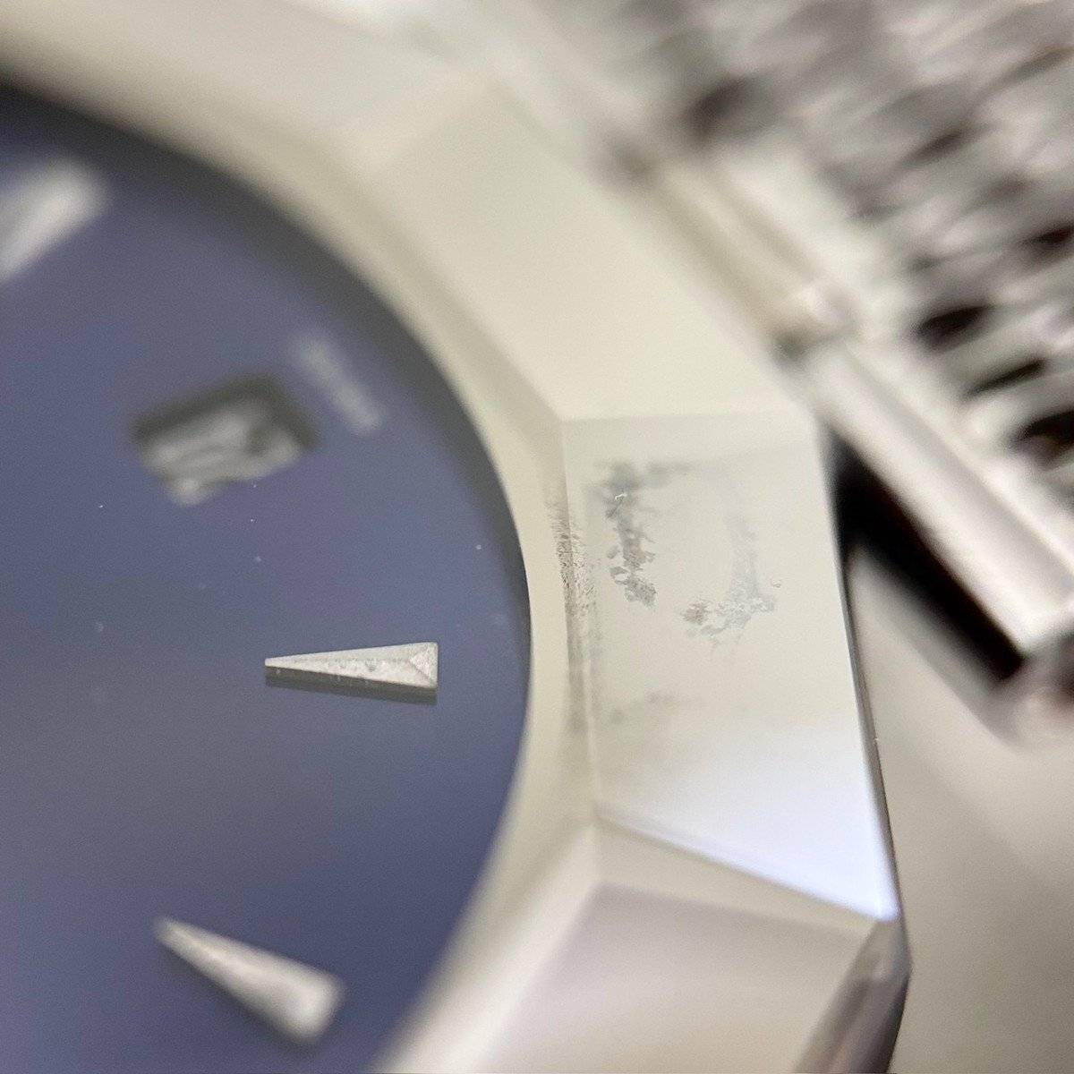 ・7時位置のケースとガラスを貼り合わせている接着剤に剥がれがあるようで、また6時位置、11時位置などのケース側面に接着剤のはみ出しが見受けられます。