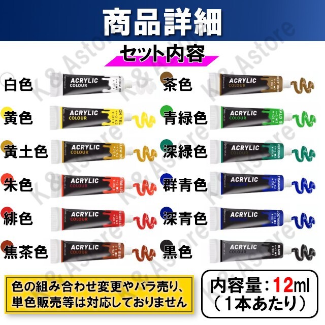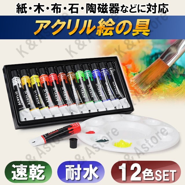 アクリル絵の具 アクリル絵具 12色 セット アクリルガッシュ 黒 白 チューブ 速乾 防水 絵画 イラスト 塗り絵 クラフト 美術 画材 アート