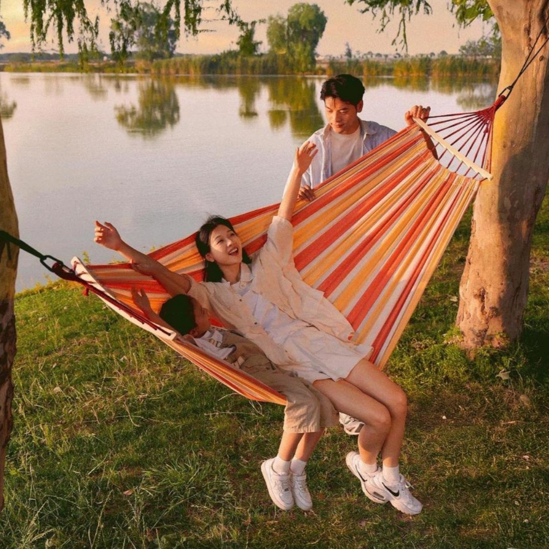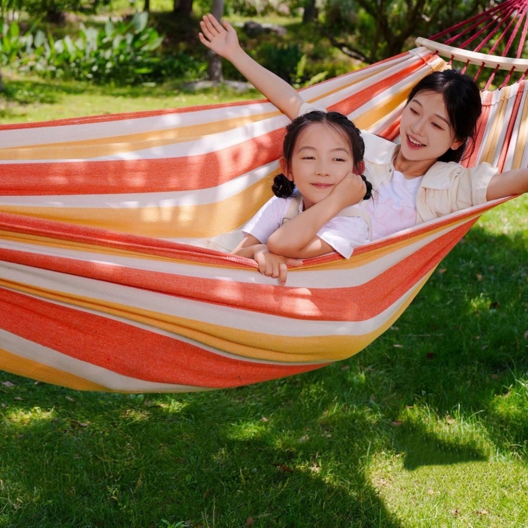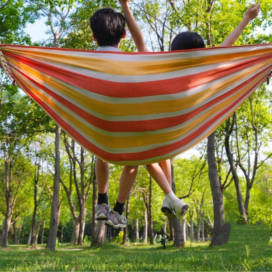 【ここがポイント】綿麻混の素材を採用し、十分な厚さと通気性があり、丈夫で破れにくい、250kgまでの耐重荷全く問題なし。両端に木棒が付いている仕様、ハンモックが絡まりにくく、扱いやすくなります。
