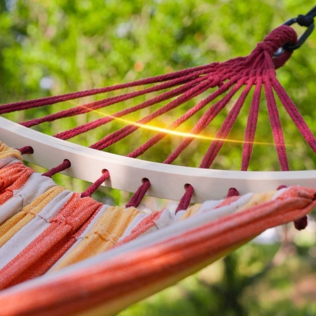 【設置簡単】ハンモックはカラビナが付き、ロープでハンモックを2本の木に吊るしたりすることたけで完成。ハンモックを設置するのに数分しかかかりません。