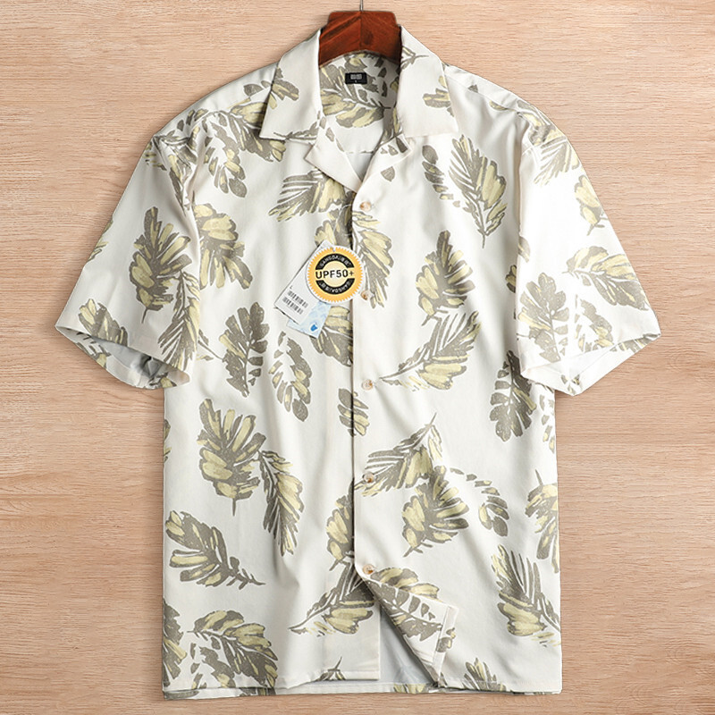 T1842-L ベージュ 新品 アロハシャツ 半袖 UPF50+ サマー メンズ 総柄 薄手 速乾 接触冷感 オープンカラー ゆったり シャツ 春夏 リーフプリント 盛夏 開襟 アロハ トップス