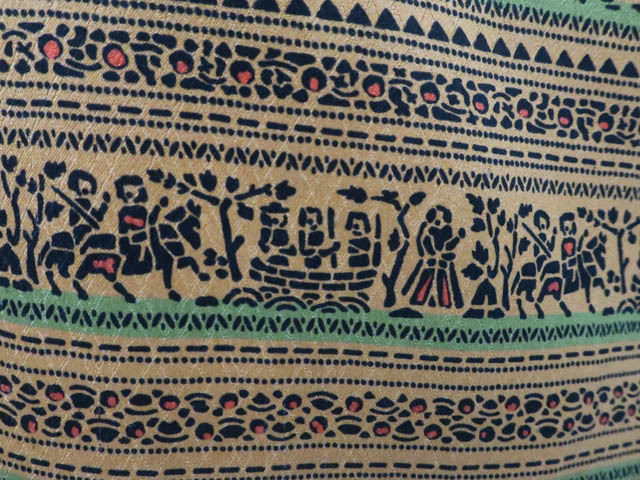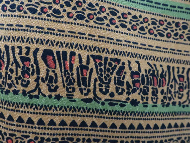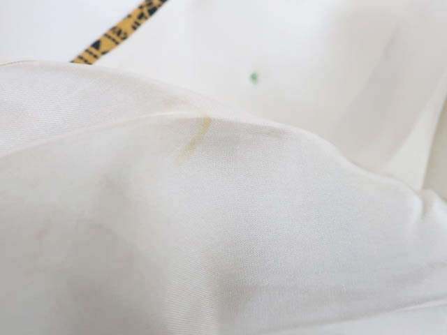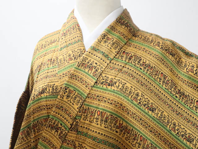 リサイクル商品のため、胴裏・八掛・衿に薄汚れがございます。 衿裏スナップボタン汚れがございますが着用可能なお品です。 地色は黄土 です。 1枚目の画像が近いお色かと思われます。 素材は正絹です。 |