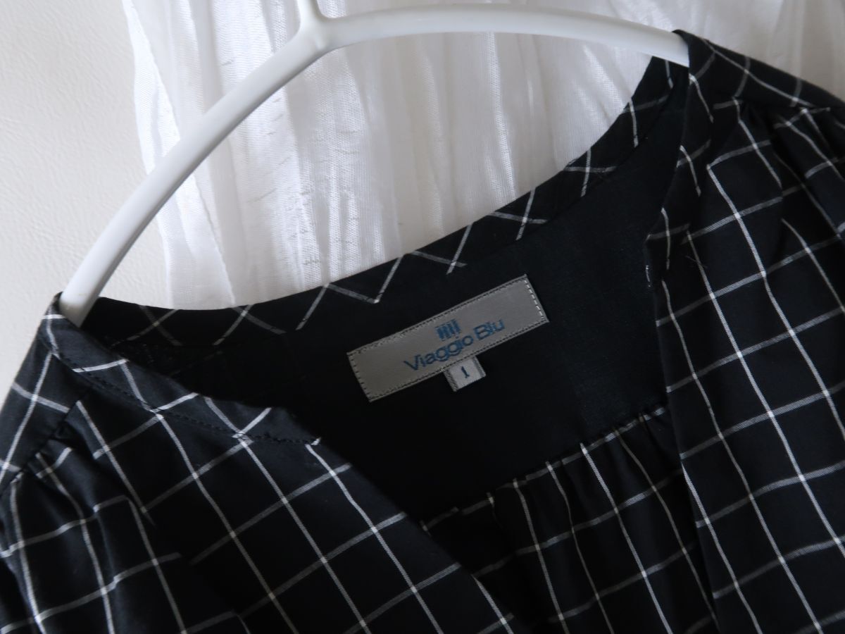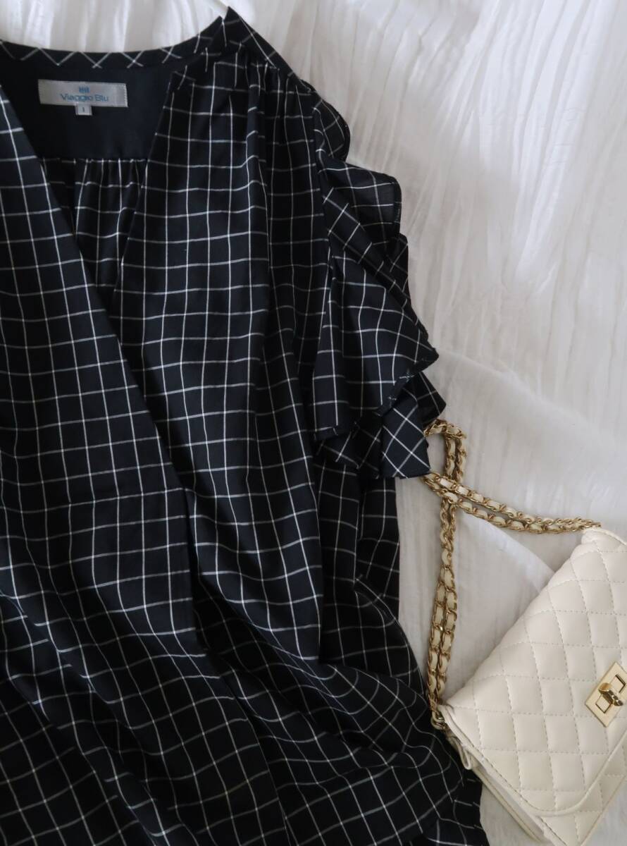 ビアッジョブルー Viaggio Blu☆洗える ブロックチェック フリルノースリーブブラウス 1サイズ 日本製☆M-S 4475